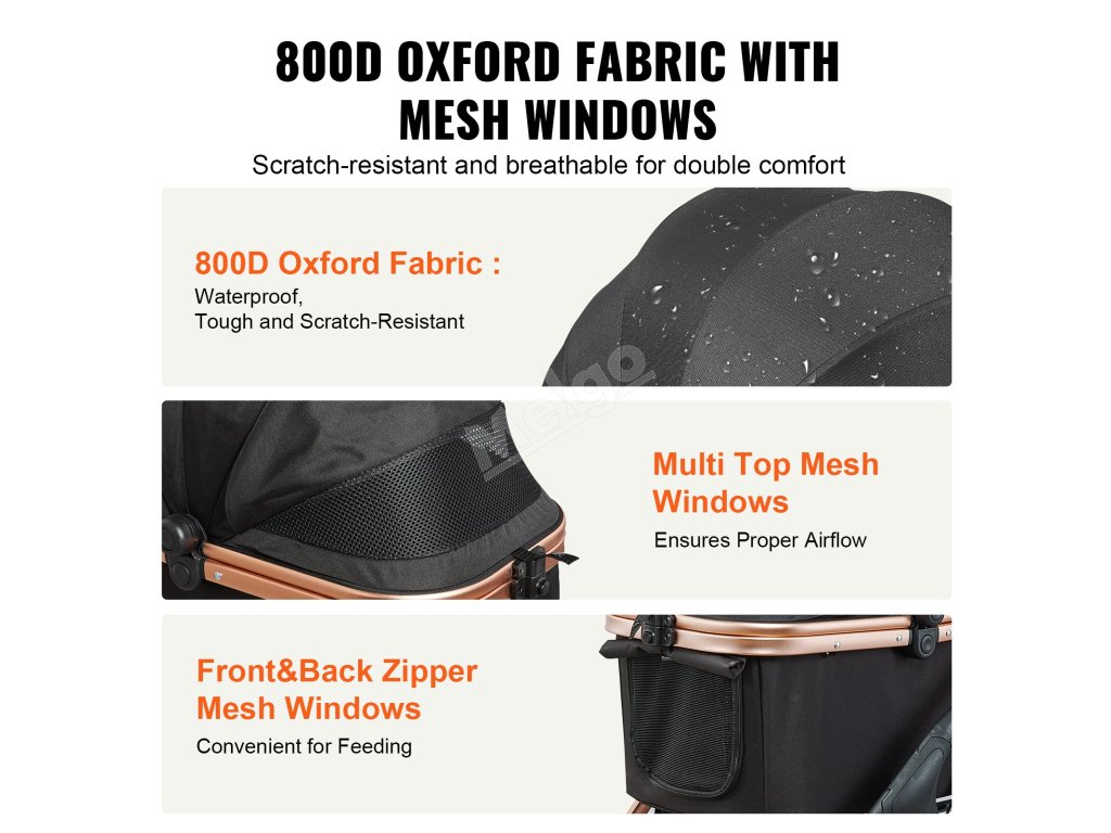 Kočárek pro psy má několik oken se síťkou, která vašemu mazlíčkovi umožní širší zorné pole a bližší spojení s okolním světem. Odolná tkanina 800D Oxford zajišťuje, že kočárek obstojí ve zkoušce času, a zaručuje bezpečnost a pohodlí, i když se váš mazlíček rozruší.