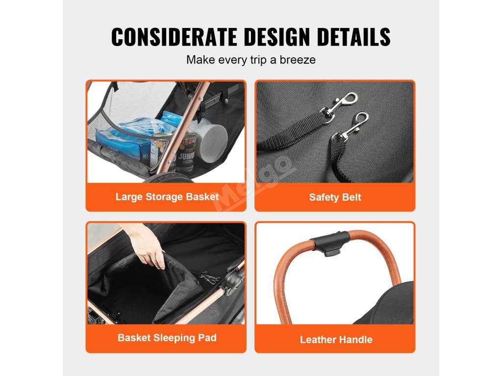 Velkorysý prostor kočárku umožňuje vašemu mazlíčkovi cítit se pohodlně a uvolněně, zatímco velký úložný koš pojme různé potřeby pro domácí mazlíčky. Zabudované bezpečnostní vodítko zajišťuje lepší ochranu vašeho mazlíčka a poskytuje klid na každé cestě.
