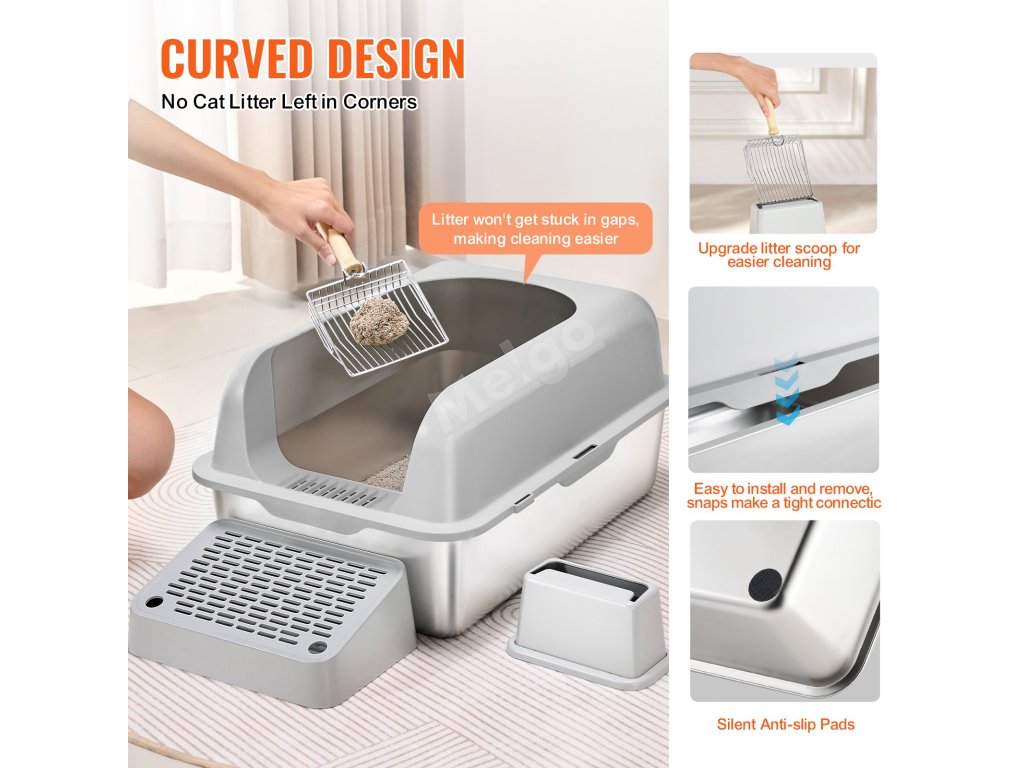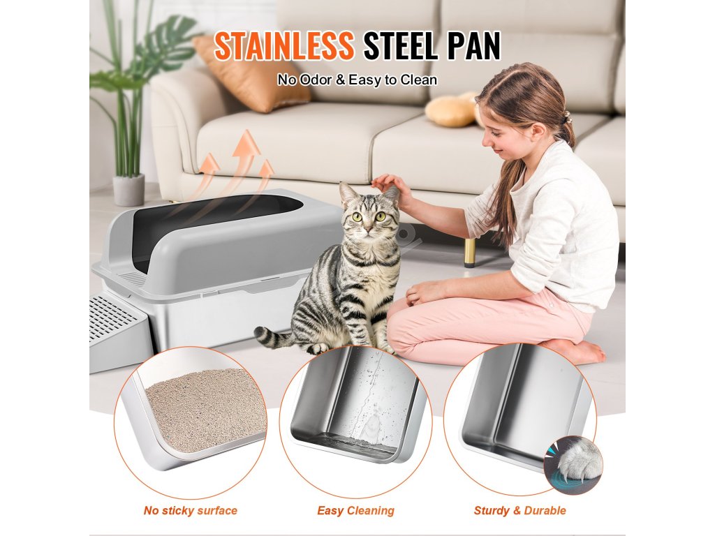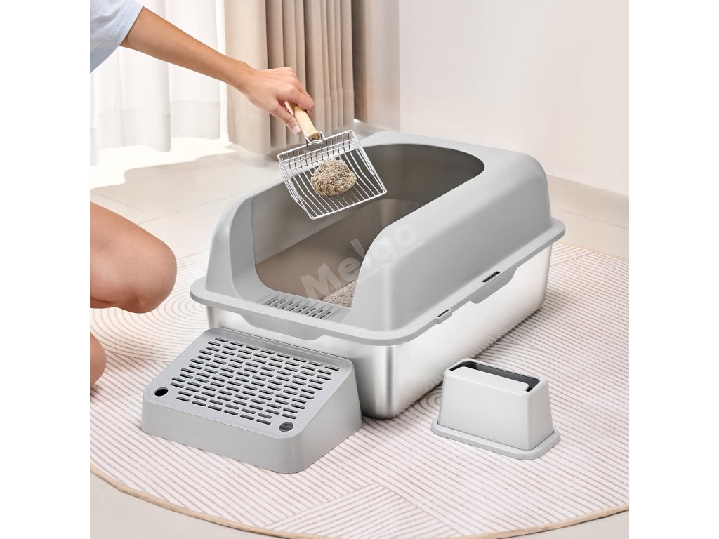 Tento box na kočičí stelivo je vyroben z nerezové oceli odolné proti opotřebení, kterou není snadné poškrábat a lze ji ihned umýt. Čtyři protiskluzové nožičky mezitím zajišťují, že je box na stelivo stabilní a nepohybuje se, čímž udržuje prostředí čisté a bez zápachu.