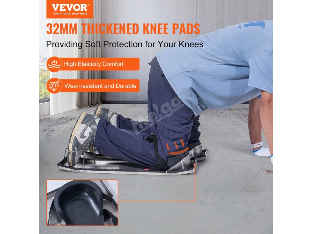 Celá sada kneeboardu s betonovým jezdcem je dodávána s kolenní podložkou, popruhy a přezkami pro utažení. Lehká konstrukce se hodí pro rozsáhlé stavební práce při dokončování betonu.