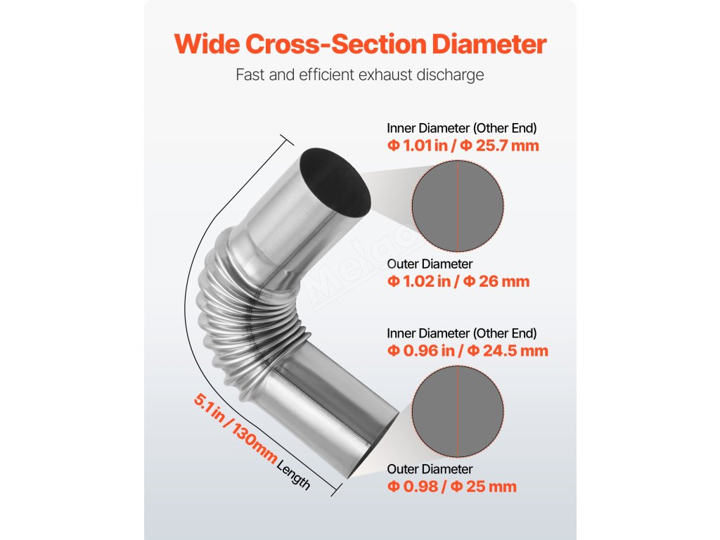 Naše koleno výfukového potrubí parkovacího ohřívače s velkým průměrem má otvor Φ 0,98 palce / Φ 25 mm, který urychluje vypouštění výfukových plynů. Minimalizuje vnitřní akumulaci, což pomáhá zachovat efektivní provoz ohřívače při delším používání.