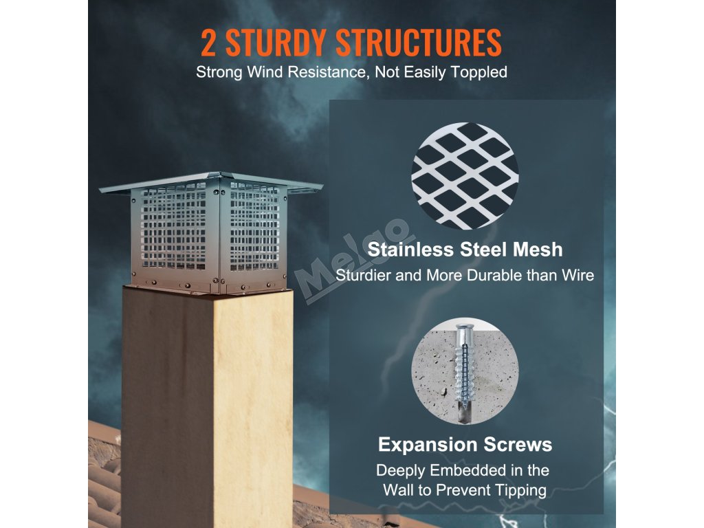 Rozlučte se s ucpáváním komína cizími předměty a zabraňte průchodu zvířat, nečistot nebo listí, čímž zajistíte volný průchod komínem. Kryt odolává silným poryvům větru a zabraňuje padání jisker.