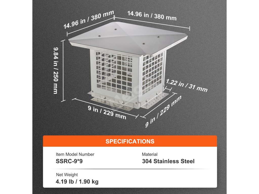Komínová čepice 228.6×228.6 mm, nerezová ocel 304 pro tašky