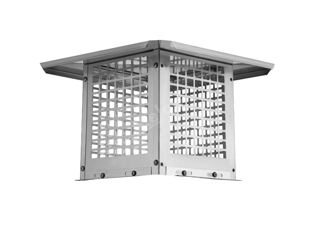 Horní kryt je vybaven šrouby, takže jej lze snadno sejmout pro běžné čištění komína. Díky šikmým bočním panelům účinně zabraňuje hromadění nečistot, deště a sněhu, což je pohodlnější a jednodušší.