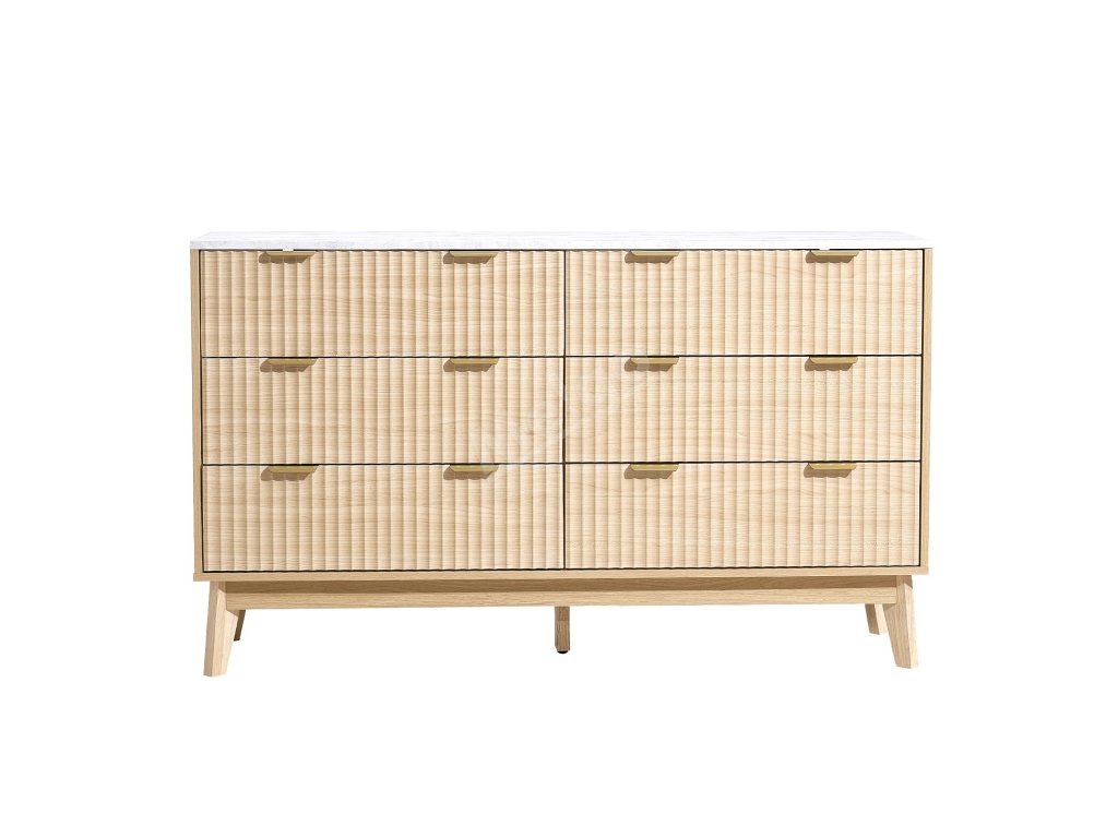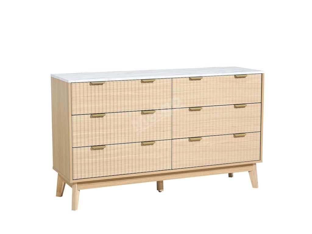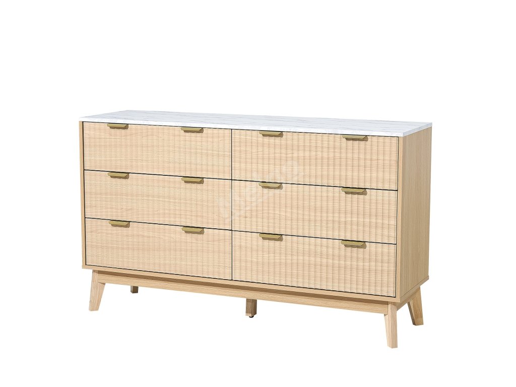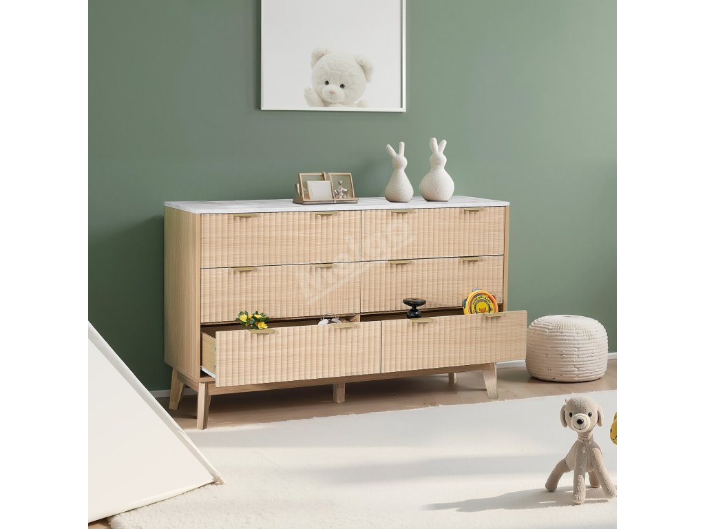 Komoda 6 zásuvek, rýhovaná čela, světlé dřevo, proti převrácení