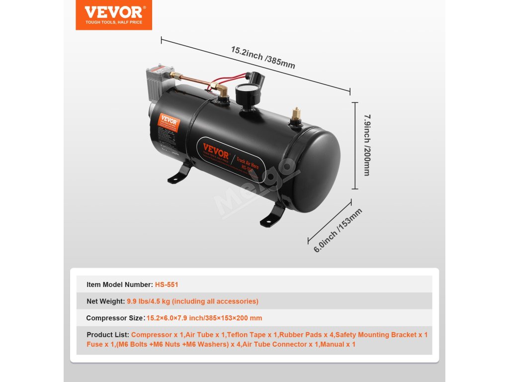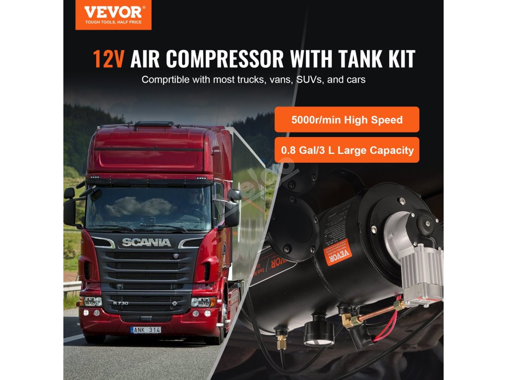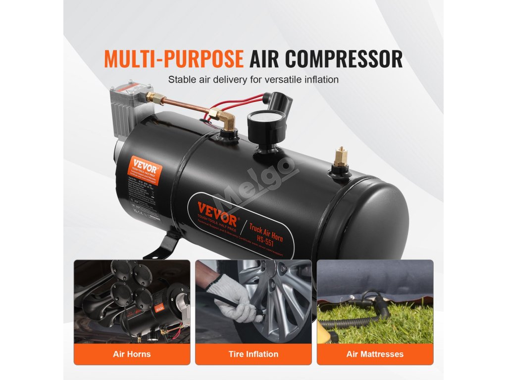 Tato sada palubního vzduchového kompresoru obsahuje nádrž na vzduch o objemu 0,8 galonu, kompresor a potrubí. Kompresor je navržen pro automatický provoz a udržuje optimální tlak v nádrži v rámci svého provozního rozsahu. Výborně se hodí pro různé aplikace včetně vzduchových houkaček, huštění pneumatik a nafukování vzduchových matrací.