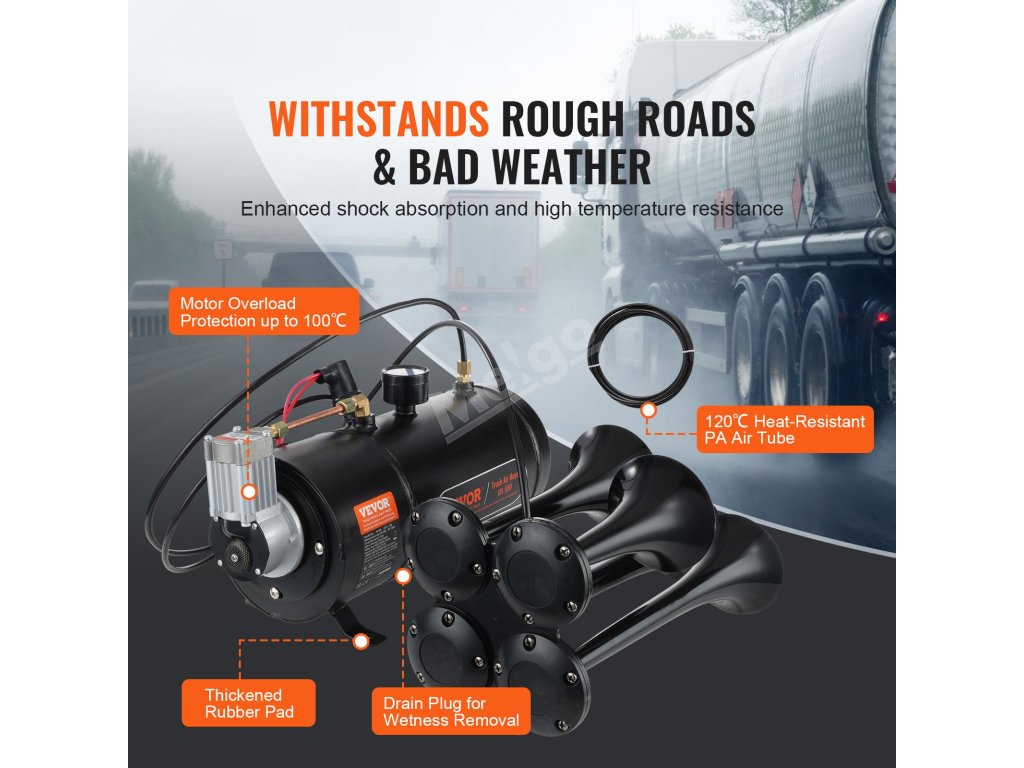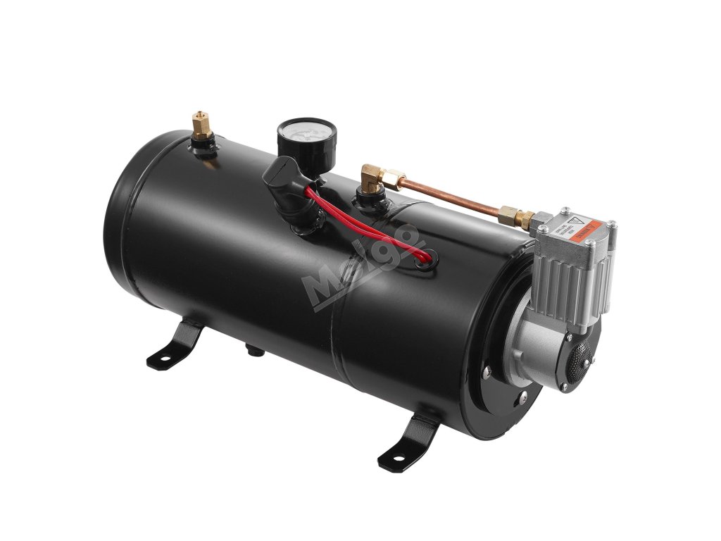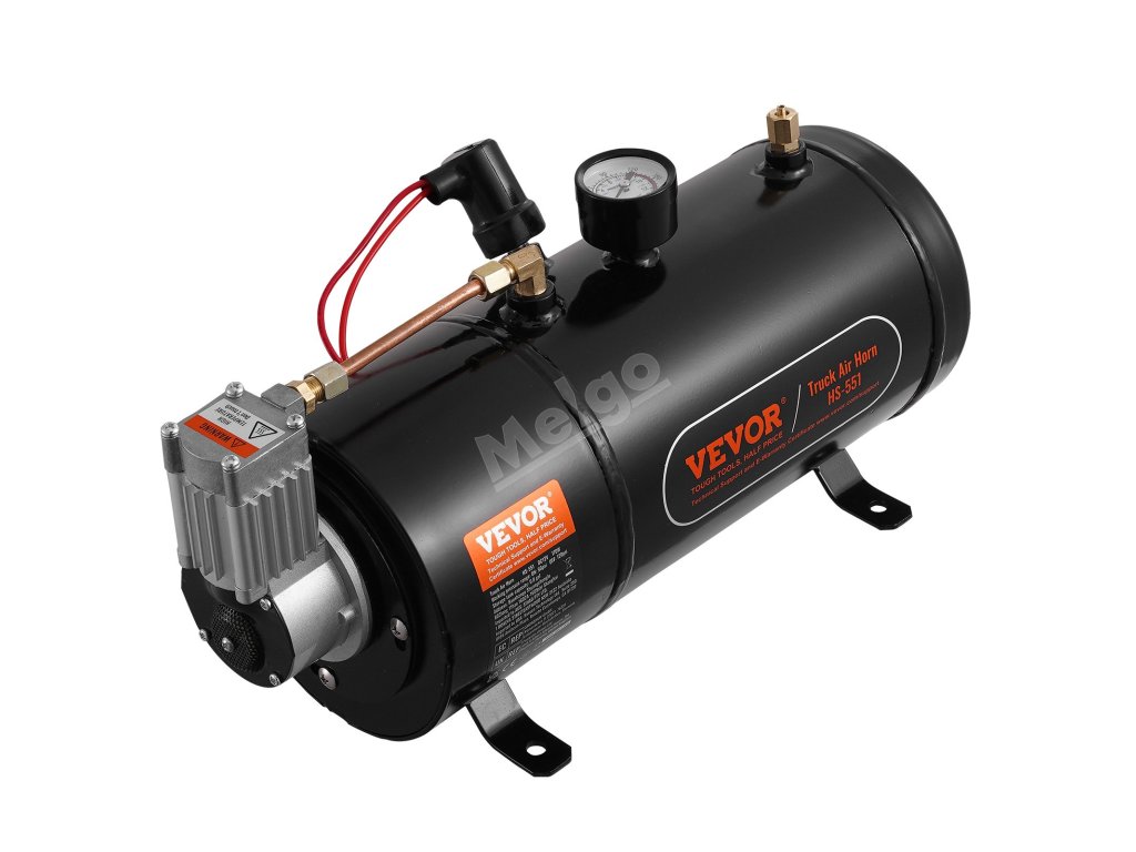 Kompresor pracuje automaticky, nafoukne se, když tlak v nádrži klesne pod 90 psi, a zastaví se při tlaku nad 120 psi, aby se zabránilo přetlakování. Nádrž monitoruje citlivý manometr a vylepšená netěsná konstrukce zajišťuje spolehlivou aktivaci klaksonu s minimálním zpožděním nebo rizikem poruchy.
