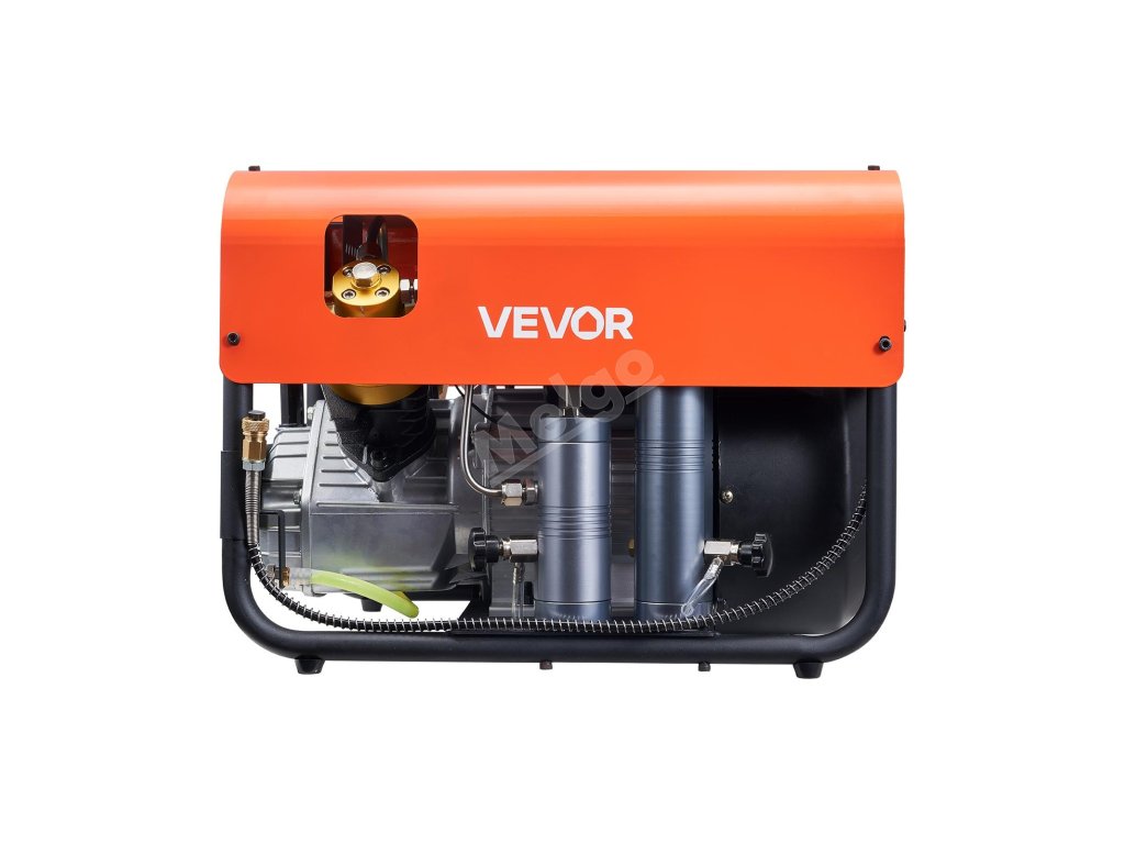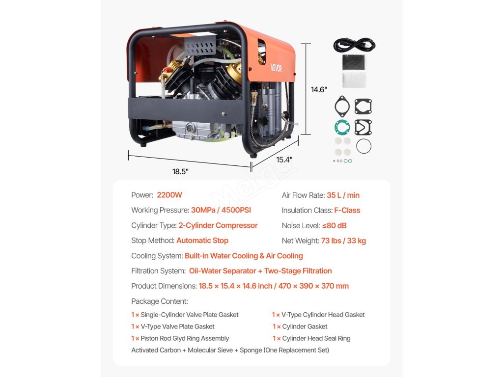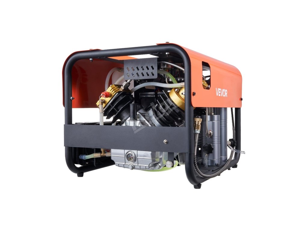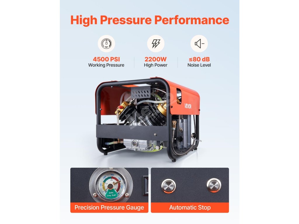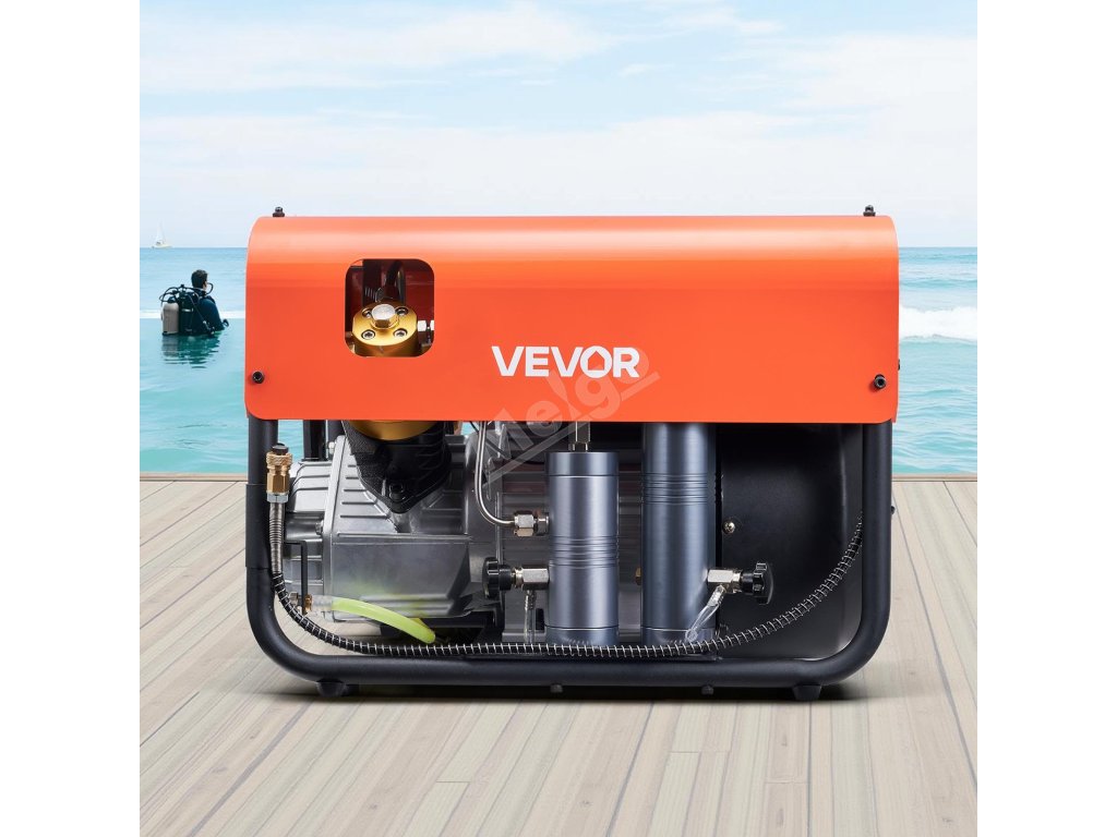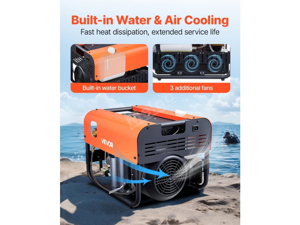 Tento dvojvalcový vzduchový kompresor VEVOR na potápanie s potápačskou nádržou má vysoký výkon 2200 W a maximálny tlak 4500 PSI (30 MPa), ktorý poskytuje vysoký prietok vzduchu 35 l/min. Jeho zabudovaný systém chladenia vodou a ventilátorom zabezpečuje účinný odvod tepla, čím zabraňuje prehriatiu a zaisťuje bezpečnosť.