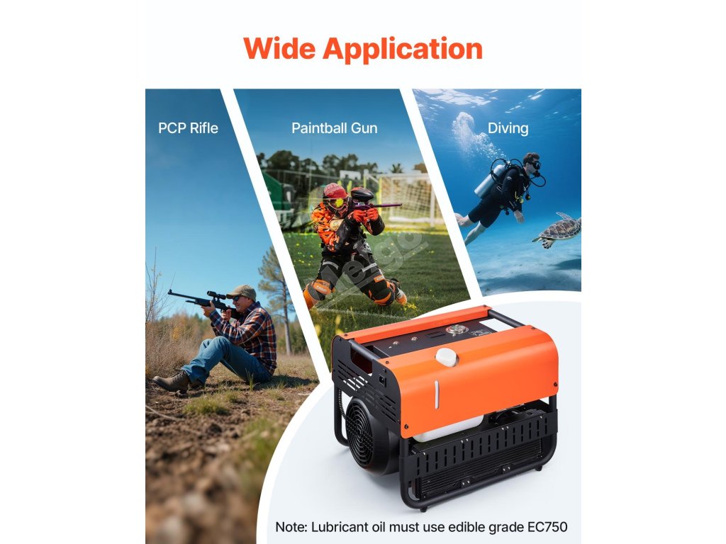 Tento vysokotlakový vzduchový kompresor PCP je ideálny na potápanie, pušky PCP, paintballovú streľbu, hasenie požiarov, zisťovanie netesností, tlakové skúšky a ďalšie účely, pričom spĺňa širokú škálu potrieb vysokotlakového vzduchu. (UPOZORNENIE: Mazací olej musí byť jedlej kvality EC750)