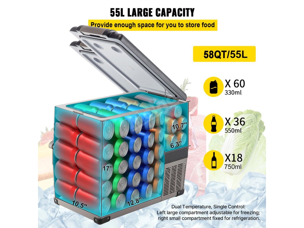 Velký prostor poskytuje dostatek místa pro skladování potravin, do kterého se vejde více plechovek a lahví najednou, aby se vyhovělo různým chutím. Nemusíte se tak obávat, že by vám na akcích nebo na cestách došlo jídlo nebo pití.