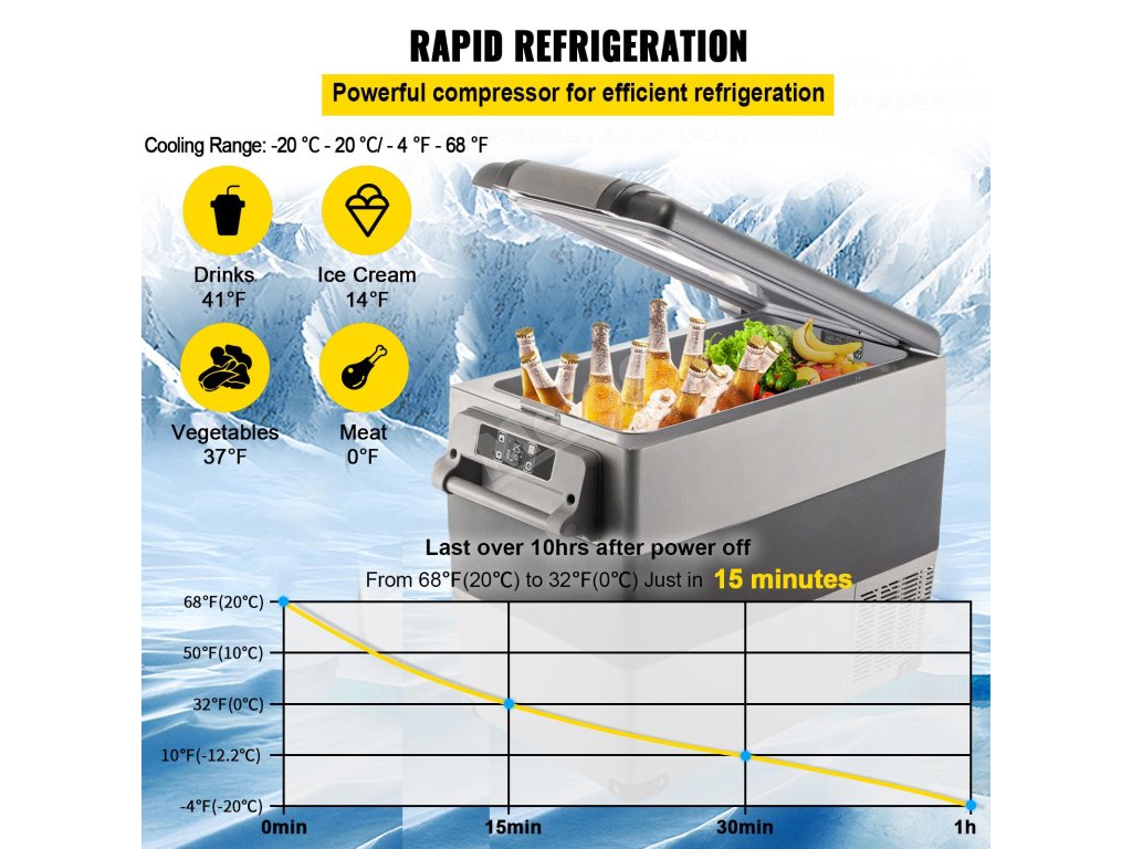Naše autochladnička má vysokou rychlost chlazení a dokáže rychle snížit teplotu z 20 ℃ na 0 ℃ za 15 minut. Po odpojení od napájení vydrží chladná po dobu 10 hodin, takže si během cesty můžete vychutnat chutné a čerstvé potraviny.