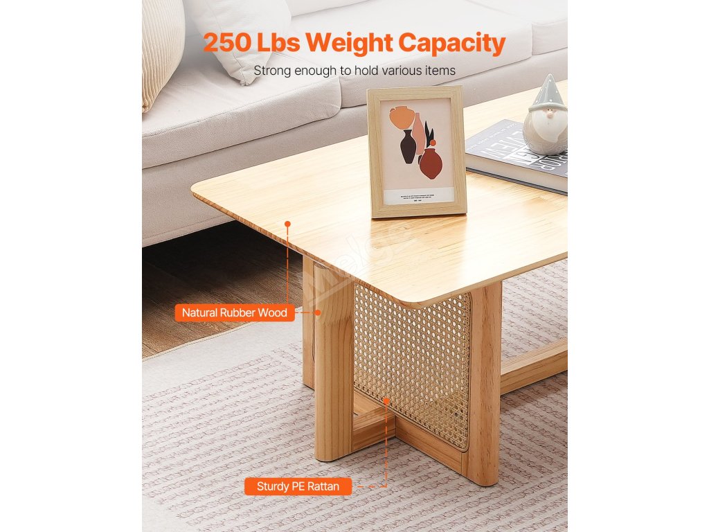 Tento obdélníkový ratanový konferenční stolek je vyroben z přírodního kaučukového dřeva a odolného PE ratanu. Má působivou nosnost 250 liber (113,4 kg), což zaručuje jeho pevnost pro každodenní použití.
