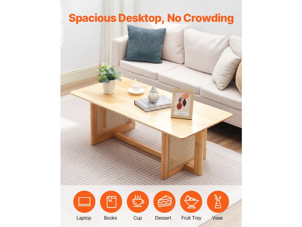 Náš boho konferenční stolek má širokou desku z jednoho kusu masivního dřeva, která mu dodává stabilitu a poskytuje dostatek prostoru pro počítač, nápoje, dálkové ovladače a další věci.