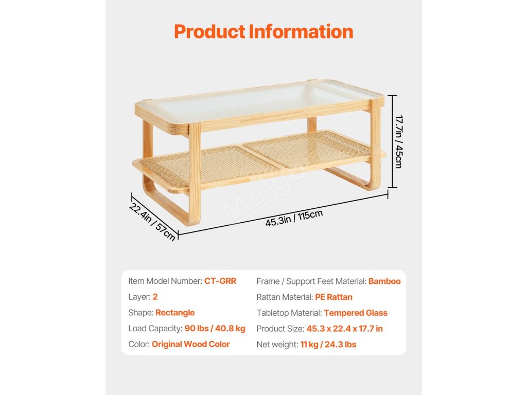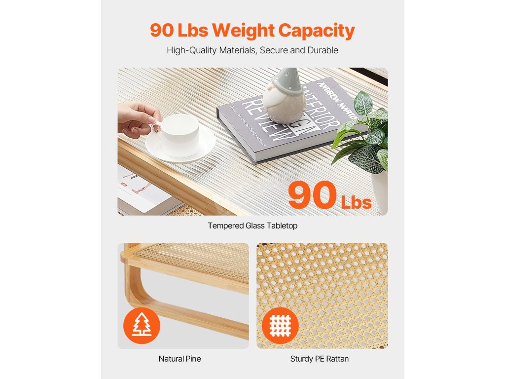Tento obdélníkový ratanový konferenční stolek s deskou z tvrzeného skla, robustním rámem z borovicového dřeva a podstavcem z PE ratanu unese úctyhodných 90 liber (40,8 kg), což zaručuje odolnost při každodenním používání.