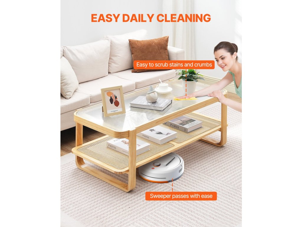 Tento ratanový konferenční stolek kombinuje bohémský styl s moderním designem. Je vybaven deskou z tvrzeného skla, unese až 90 kg a má dvoupatrovou konstrukci pro ukládání. Snadno se sestavuje a čistí. Perfektní do každého pokoje!