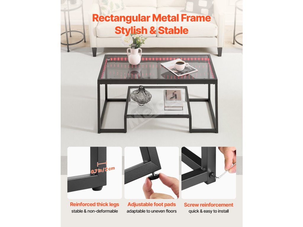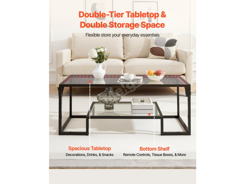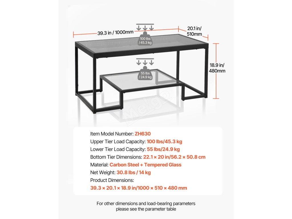 Tento konferenční stolek má prostorné, čiré, dvouúrovňové tvrzené skleněné plochy, které jsou krásné a odolné. Obdélníkový kovový rám poskytuje eleganci a stabilitu a podpoří vaše každodenní potřeby, aniž by se kymácel. Je velmi univerzální s ohledem na styl vašeho obývacího pokoje a kanceláře.