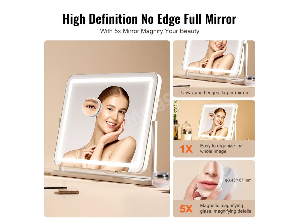 Toto kozmetické zrkadlo s vynikajúcim remeselným spracovaním vám prináša jedinečný zážitok z líčenia. Je vybavené 5-násobnou zväčšovacou šošovkou a dotykovým panelom s nastaviteľným jasom, môžete si vybrať správnu teplotu farieb, čo vám umožní ľahko zachytiť každý detail a vytvoriť nádherný vzhľad líčenia.