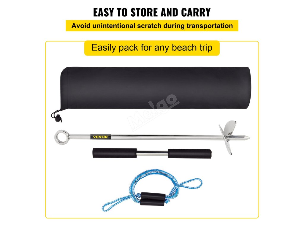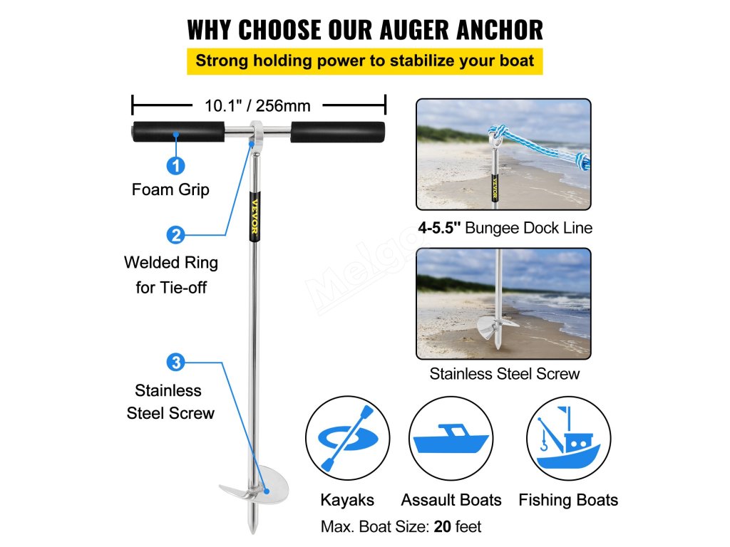 Ostrý vrták v naší tyčové kotvě pro lodě lze snadno zašroubovat do písku. Vysoká síla záběru zajistí, že vaše loď bude ukotvena na místě.