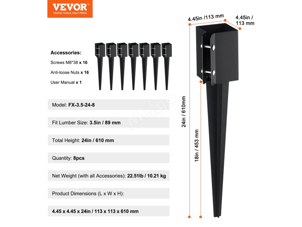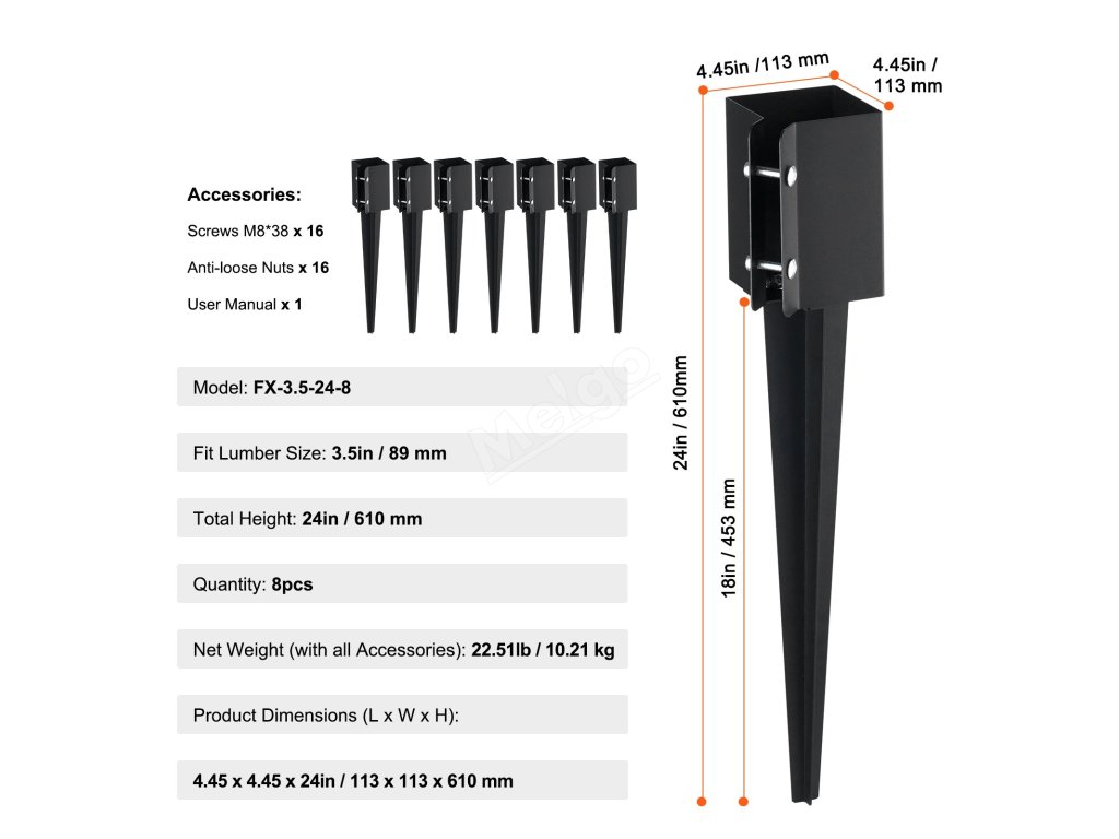 Kotva do země na sloupek 8 ks, 24×4×4 in, vnitřní průměr 3.5×3.5 in