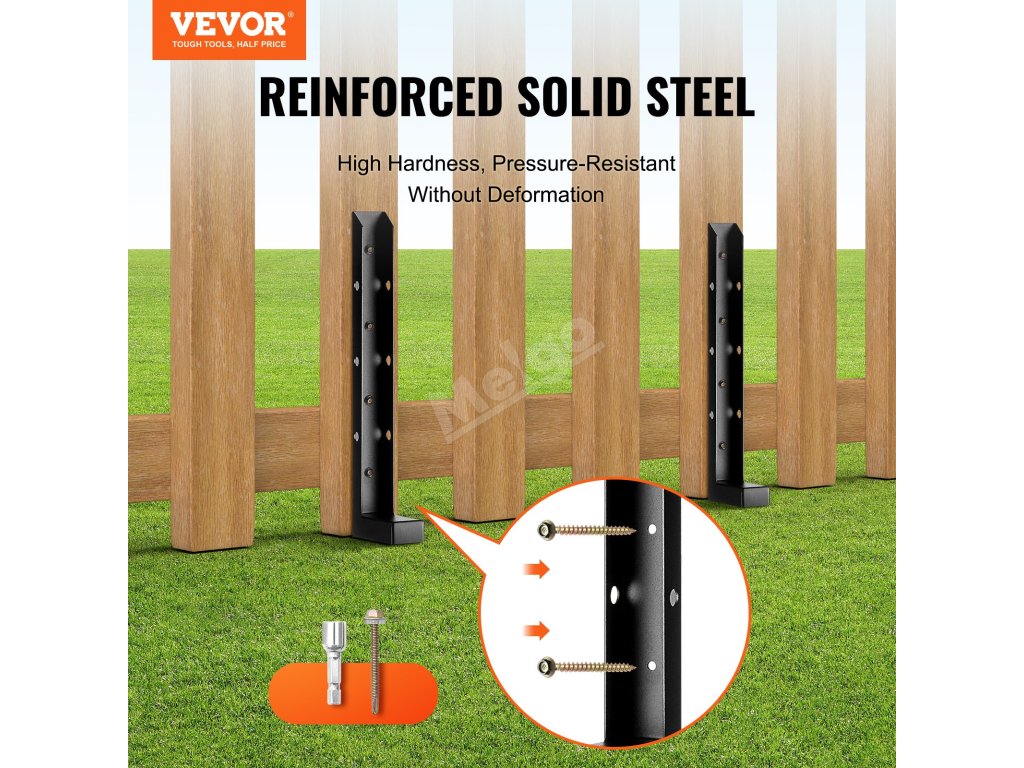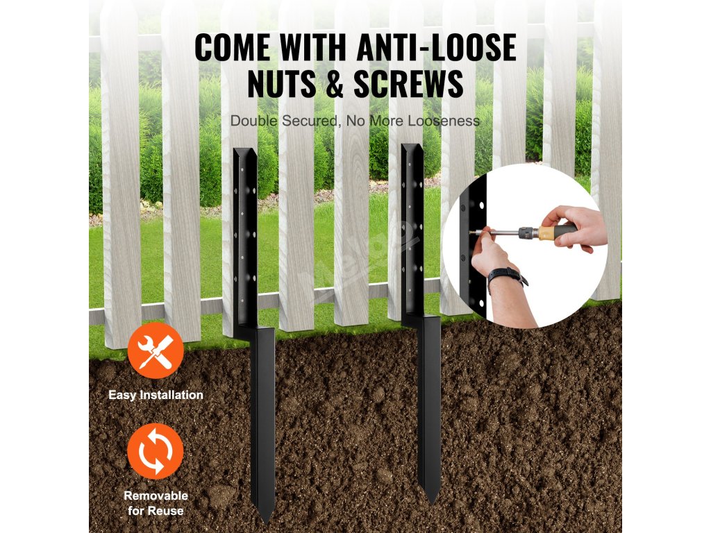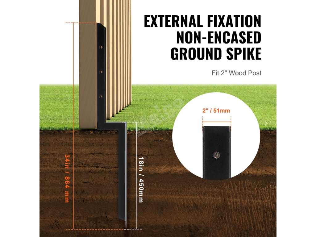 Instalace je jednoduchá - není potřeba žádný výkop ani cement. Umístěte hrot, přidejte dřevěný blok a zatlučte kladivem. Po několika úderech zkontrolujte, zda je hrot v rovině, zatlačte jej zcela do země a vyměňte jej za plotový sloupek.