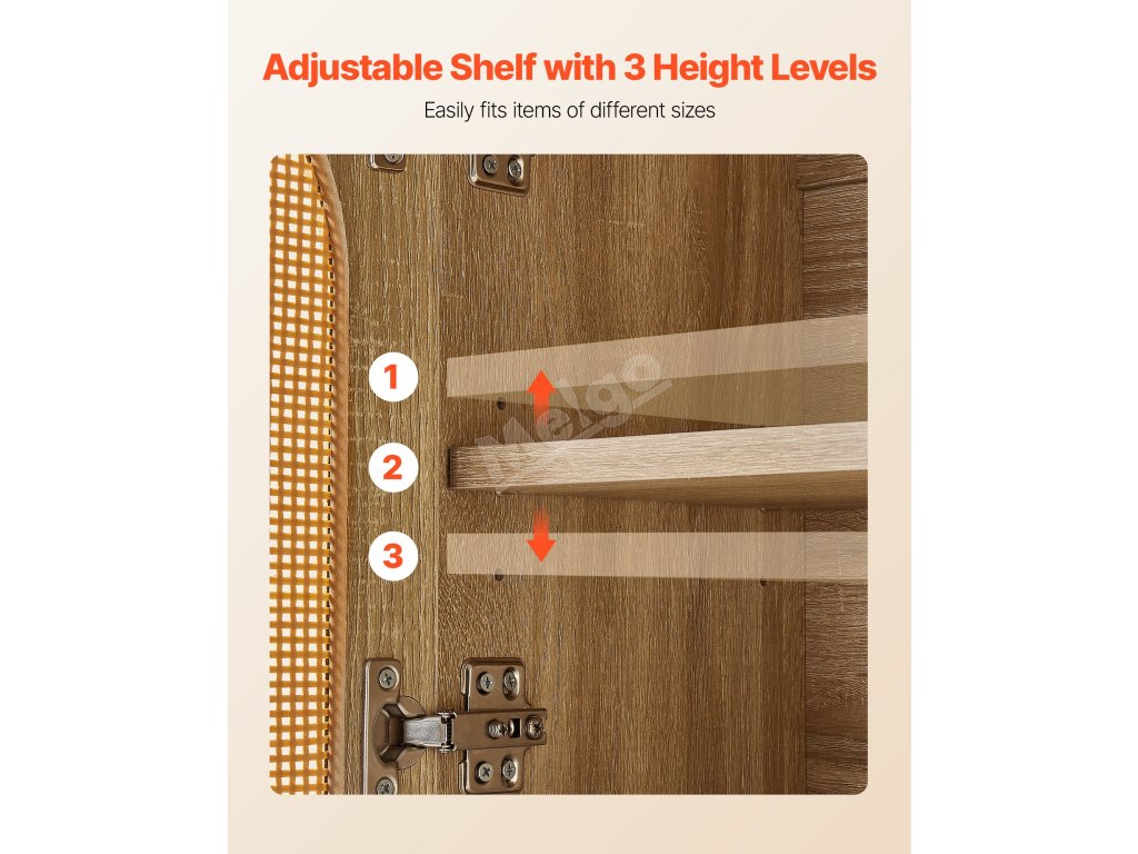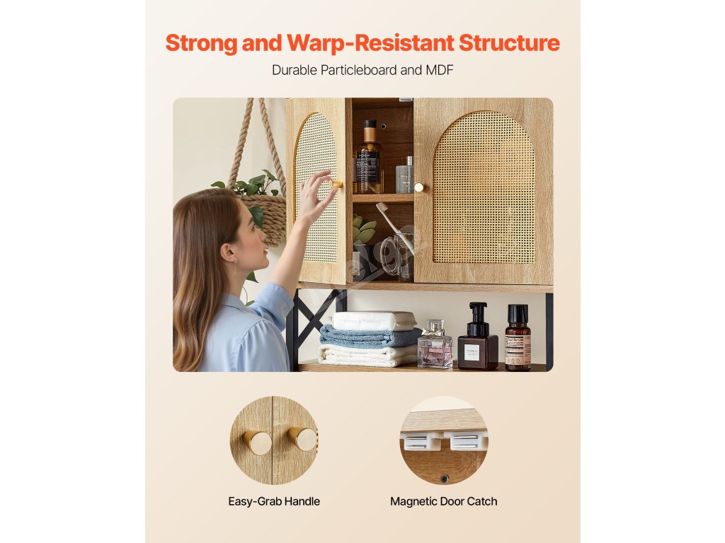 Naše závěsná koupelnová skříňka má pevný a odolný rám z dřevotřískových desek s hladkým magnetickým uzávěrem. Pohodlné úchyty a hladké hrany usnadňují otevírání a zabraňují nárazům. Police o tloušťce 0,6 palce zajišťují silnou nosnost a zůstávají dlouhodobě robustní a atraktivní.