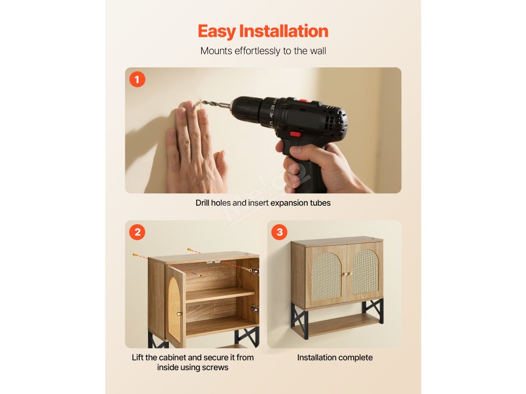 Tato nástěnná koupelnová skříňka má bezpečnou a stabilní montážní konstrukci, je dodávána s podrobným návodem k použití a kompletní sadou nářadí. Pro snadnou instalaci nejsou nutné žádné složité operace. Skříňku může na stěnu rychle namontovat jak začátečník, tak i neprofesionál.
