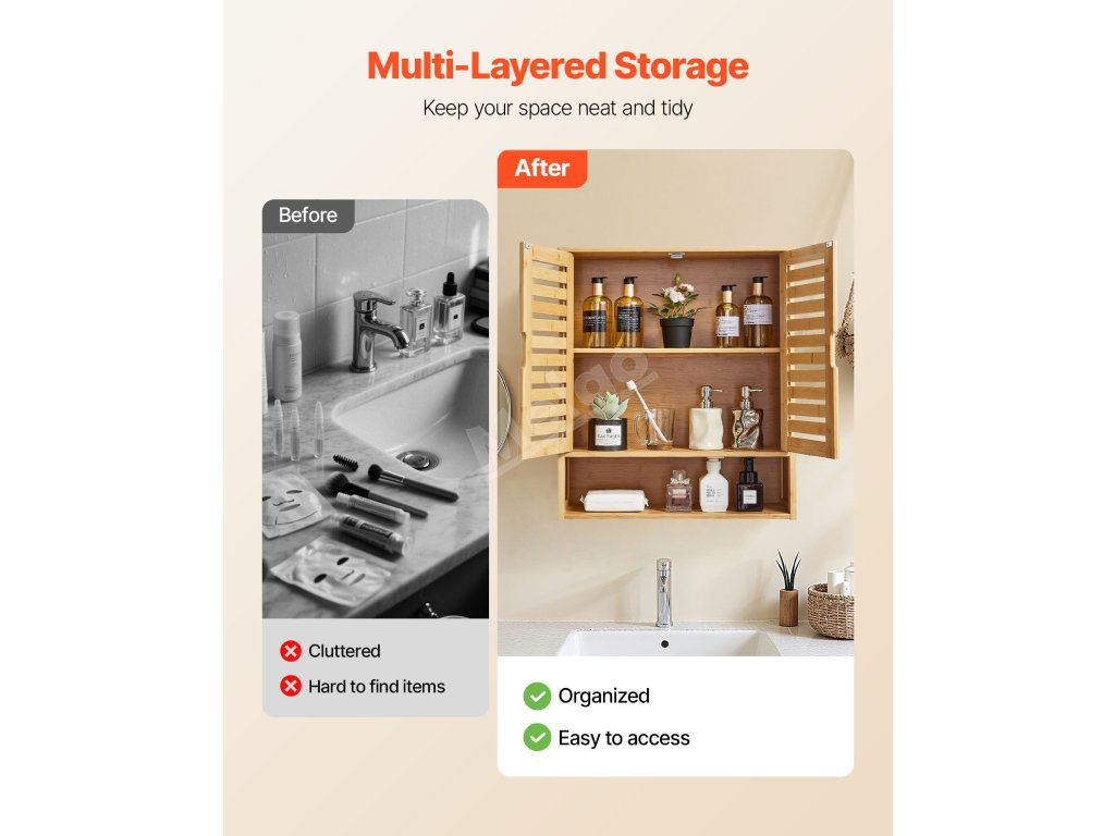 Tato multifunkční koupelnová nástěnná skříňka se snadno začlení do koupelen, kuchyní, ložnic, obývacích pokojů, chodeb a dalších obytných prostor. Flexibilně se přizpůsobí k ukládání toaletních potřeb, kuchyňských skříněk, uspořádání nepořádku v ložnici nebo k dekoraci stěn obývacího pokoje.