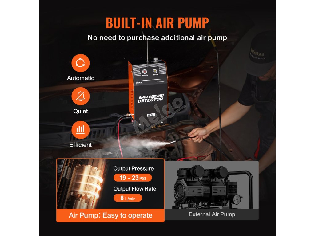 Náš stroj na testování těsnosti je vybaven vestavěným vzduchovým čerpadlem, které zajišťuje efektivní a bezproblémový provoz. Toto vestavěné čerpadlo zefektivňuje diagnostický proces a umožňuje přenášet a používat kouřový tester kdekoli, není třeba kupovat další vzduchové čerpadlo.