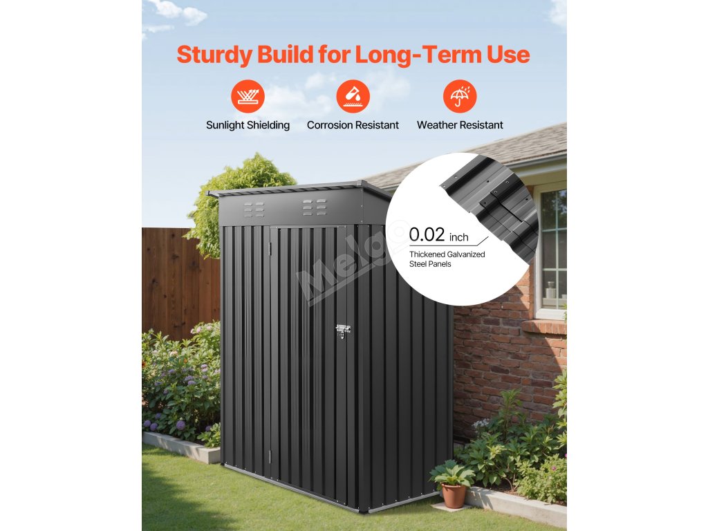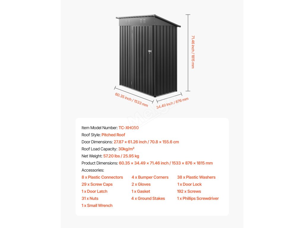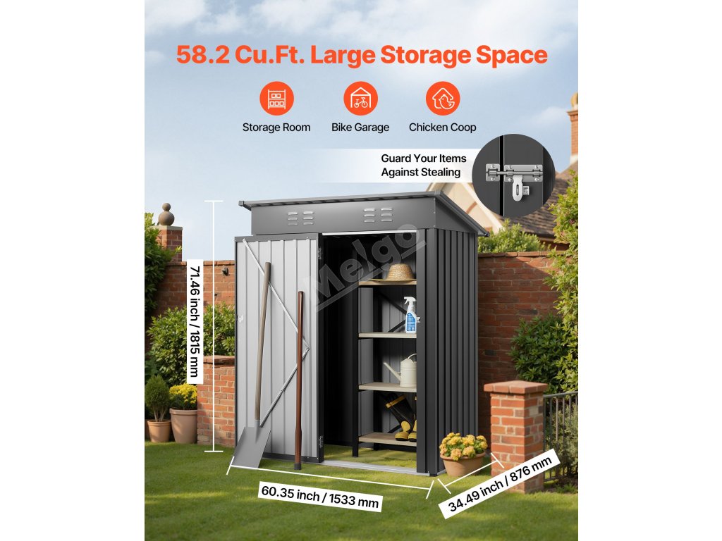 Kovový skladovací přístřešek VEVOR o objemu 58,2 m3 (60,35 x 34,49 x 71,46 palců / 1533 x 876 x 1815 mm) je ideální pro skladování zahradního nářadí a dalších předmětů. Je vyroben z pozinkované oceli, je odolný, vodotěsný a odolný vůči slunečnímu záření. Šikmá střecha zabraňuje hromadění sněhu, unese 30 kg/m². Součástí je ventilace a uzamykatelné dveře.