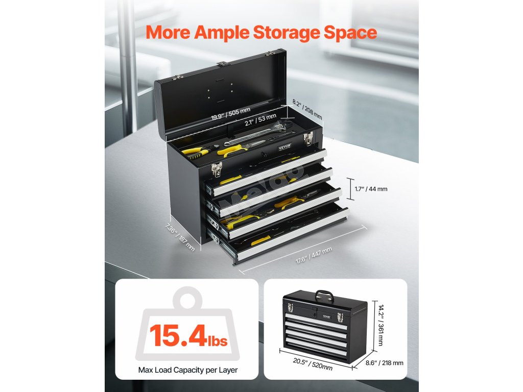 Prémiový box na nářadí s 20,5palcovou zásuvkou představuje vynikající organizační řešení s odolnou konstrukcí. Každá vrstva unese až 15 kg váhy.