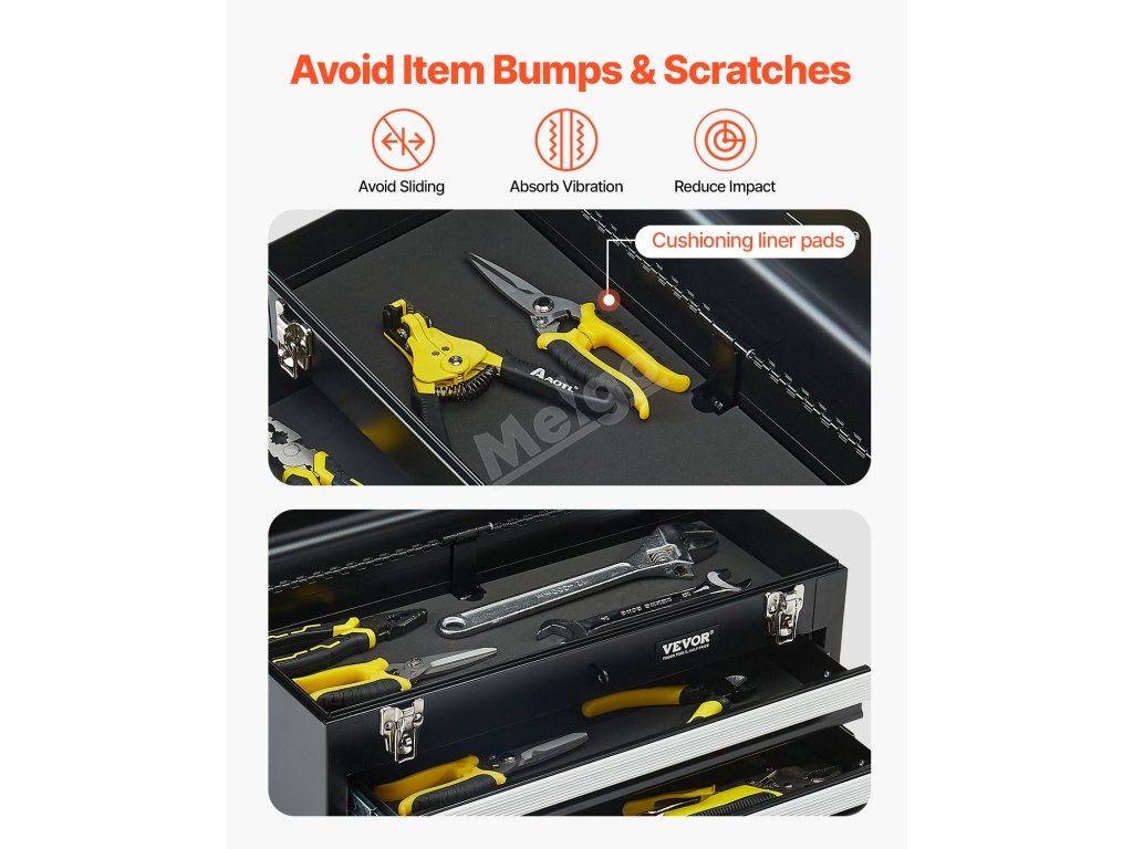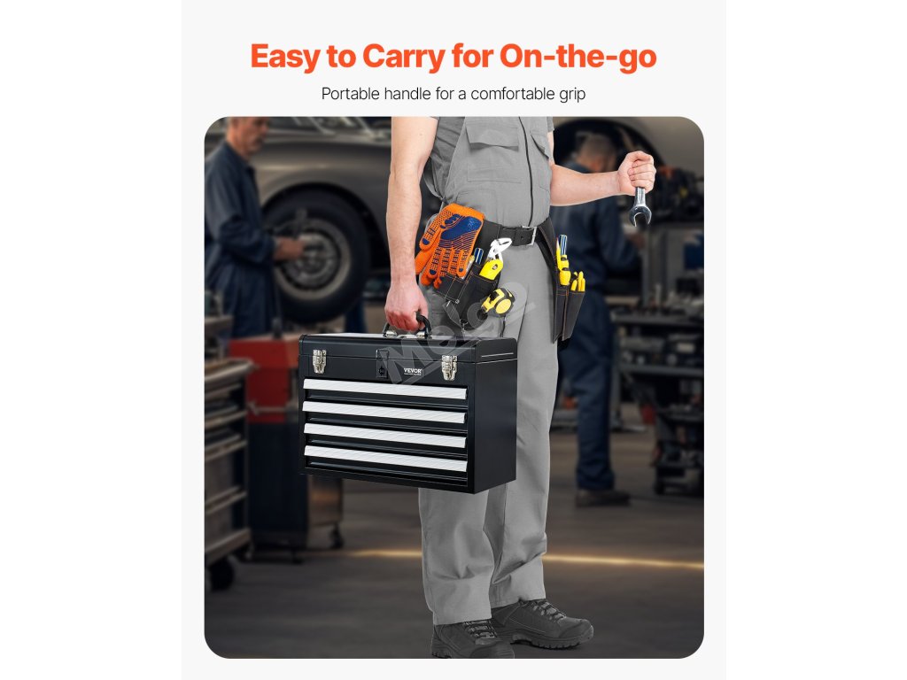 Díky praktickému madlu na horní straně můžete kovový box na nářadí snadno přenášet, kamkoli potřebujete. Hladké zásuvky s kuličkovými ložisky zajišťují plynulé otevírání a zavírání, takže ukládání je radost.