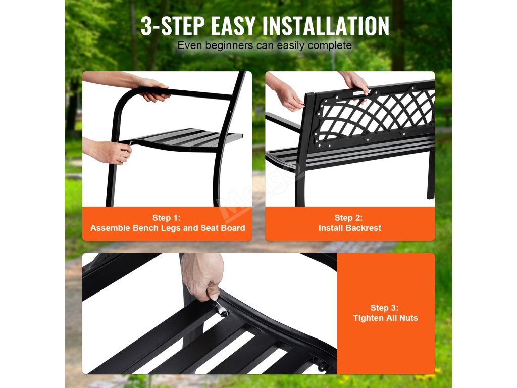 Naše venkovní kovová lavička se snadno sestavuje a nevyžaduje žádné složité nářadí ani kroky. Užívejte si svůj venkovní prostor rychle a bez námahy, ať už doma nebo v parku.