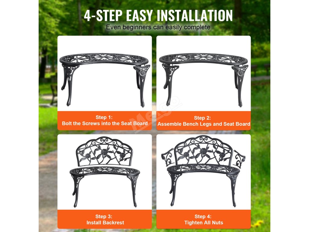Naše venkovní kovová lavička se snadno sestavuje a nevyžaduje žádné složité nářadí ani kroky. Užívejte si svůj venkovní prostor rychle a bez námahy, ať už doma nebo v parku.