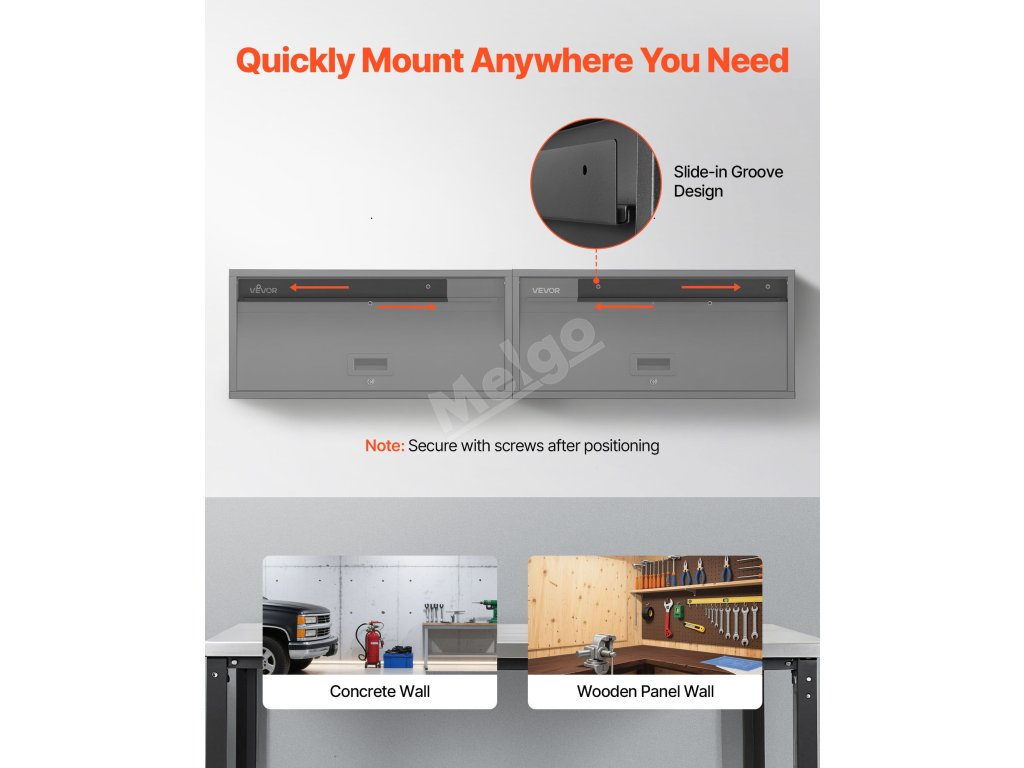 Chytrá závěsná lišta nástěnné garážové skříně umožňuje její montáž v jedné rovině s betonovými nebo dřevěnými stěnami. Získáte tak bezproblémový, leštěný vzhled se stabilitou podobnou skále.