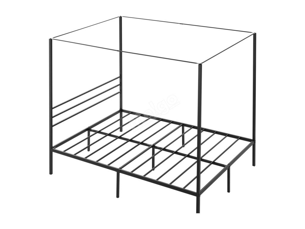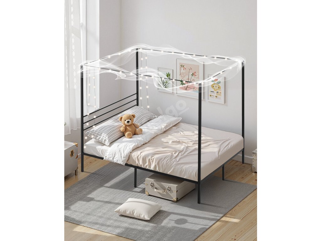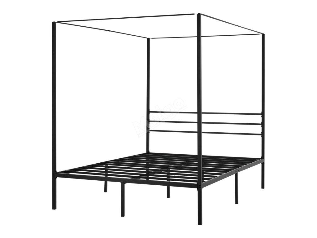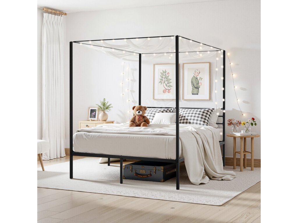 Kovová postel queen s baldachýnem 4 sloupy laťový rošt úložný prostor