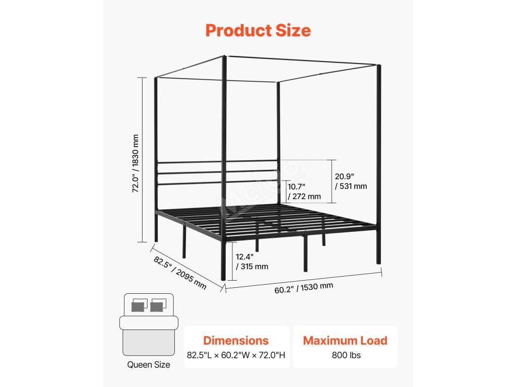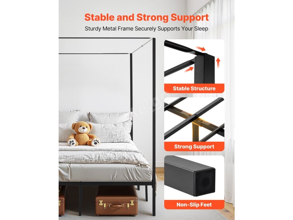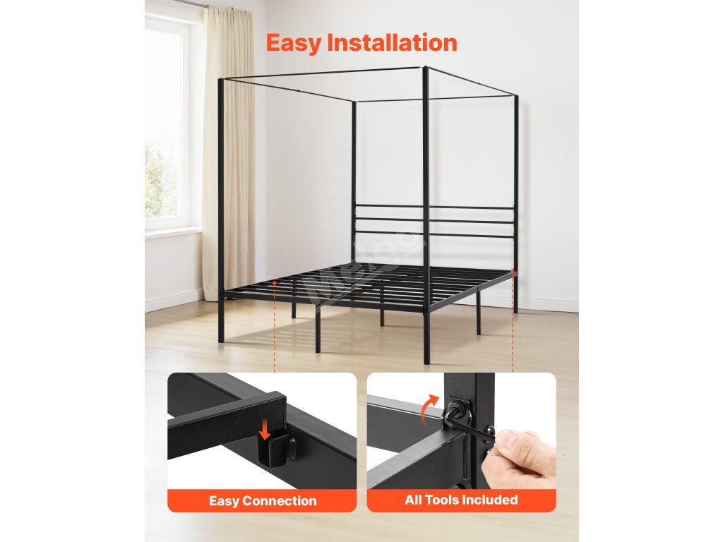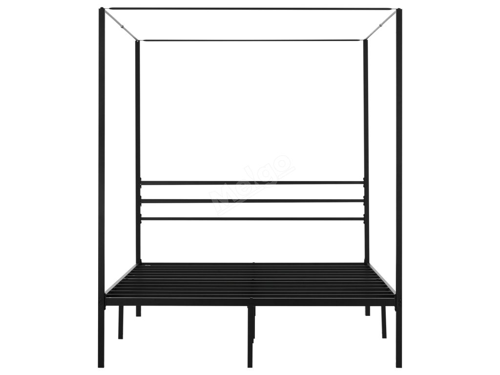 Kovová postel queen s baldachýnem 4 sloupy laťový rošt úložný prostor