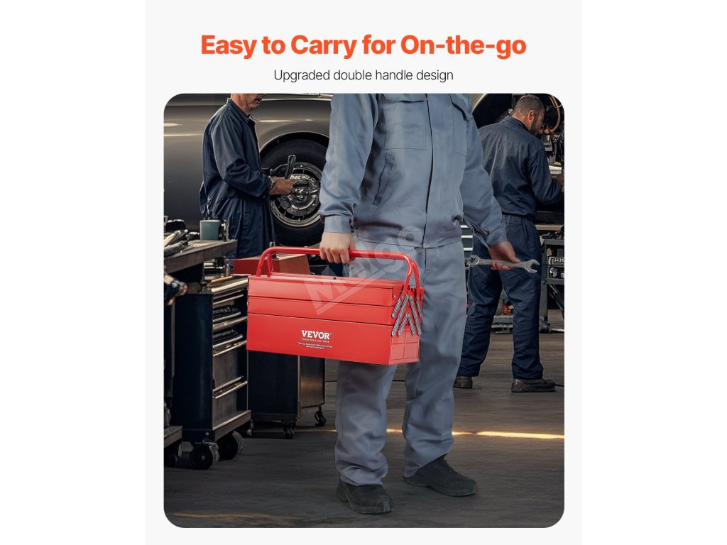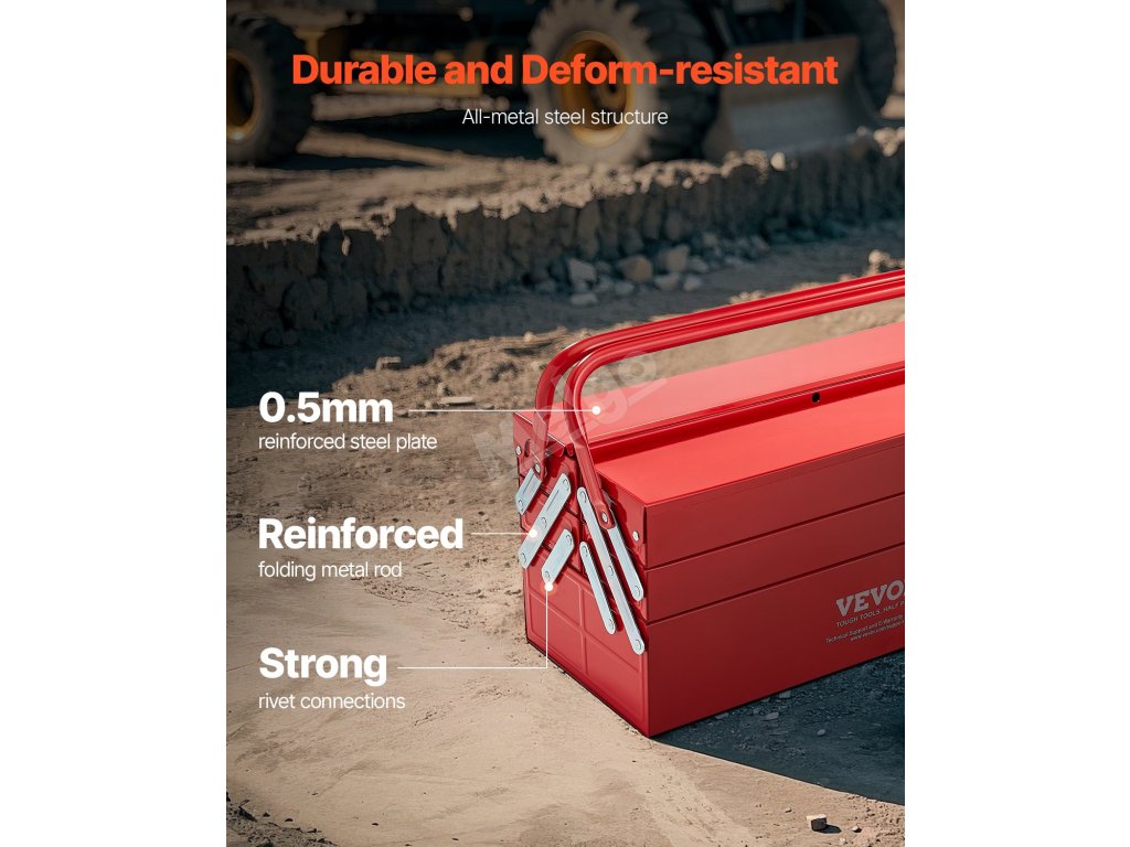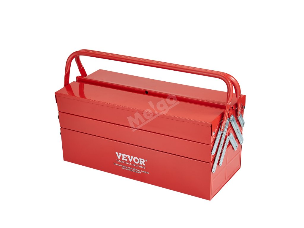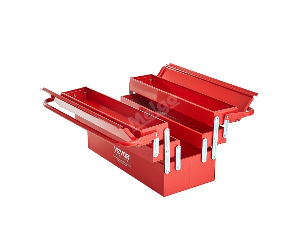 Pohodlná dvojitá držadla usnadňují přenášení kovového boxu na nářadí kamkoli. Plynulé otevírání výklopné horní části je umožněno několika zesílenými kovovými klouby, které zajišťují stabilitu a odolnost.