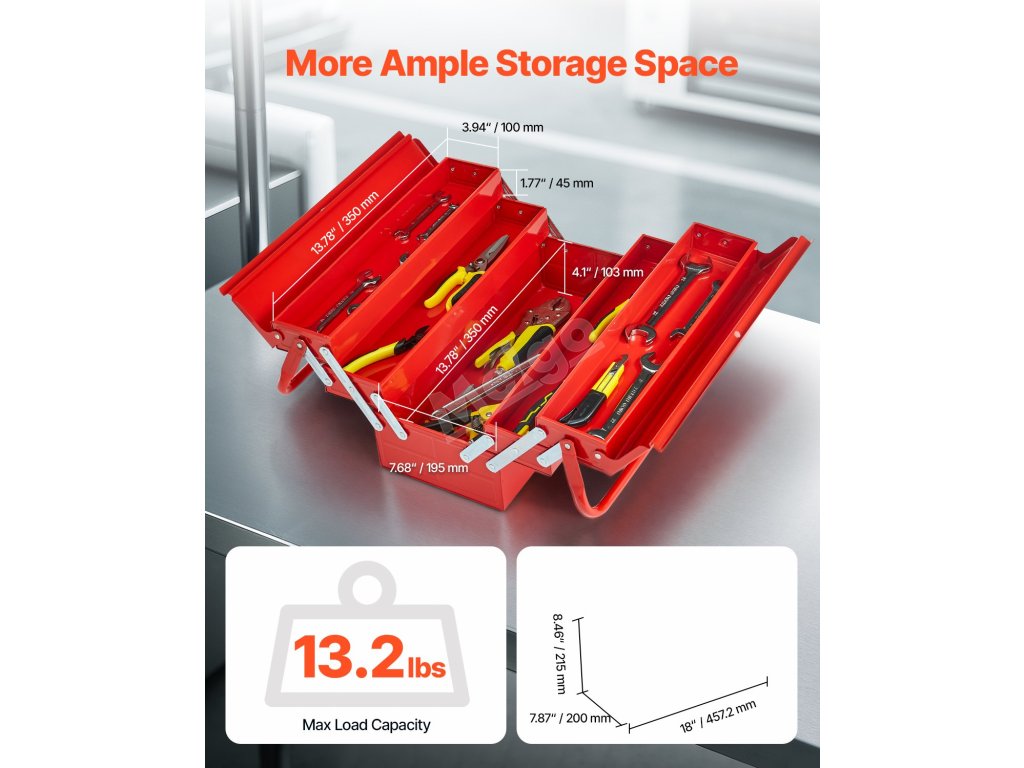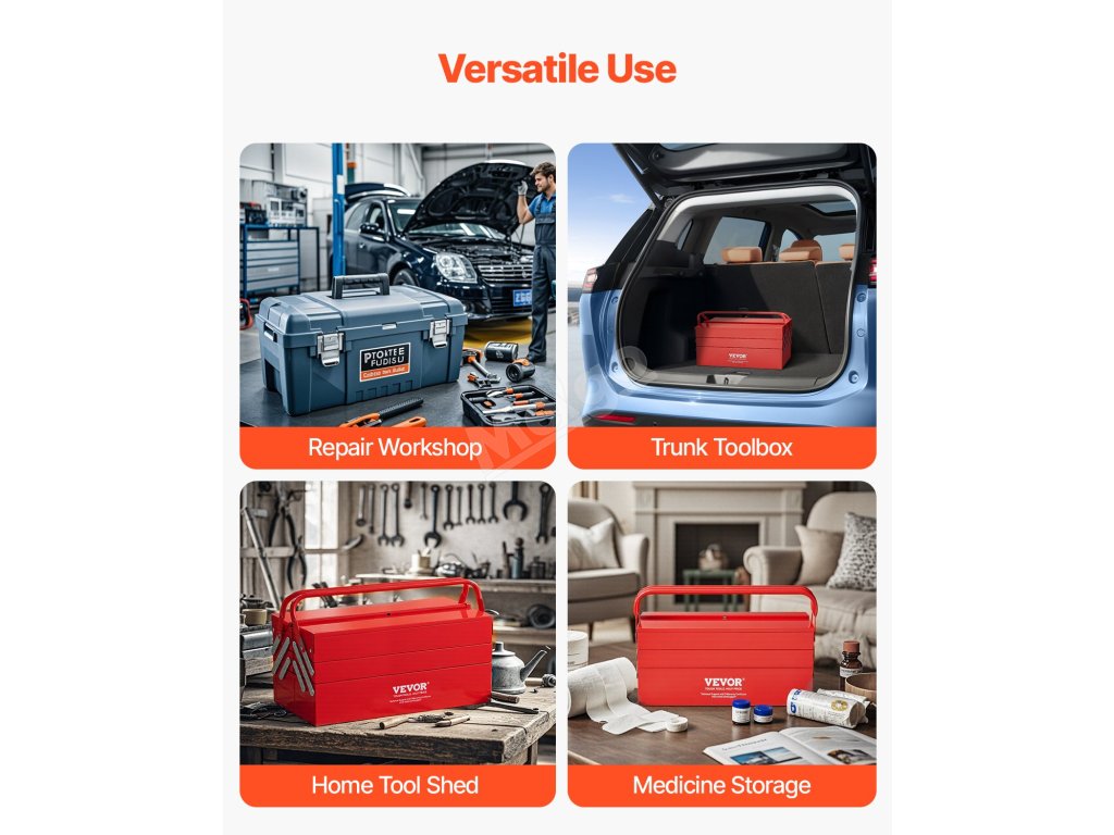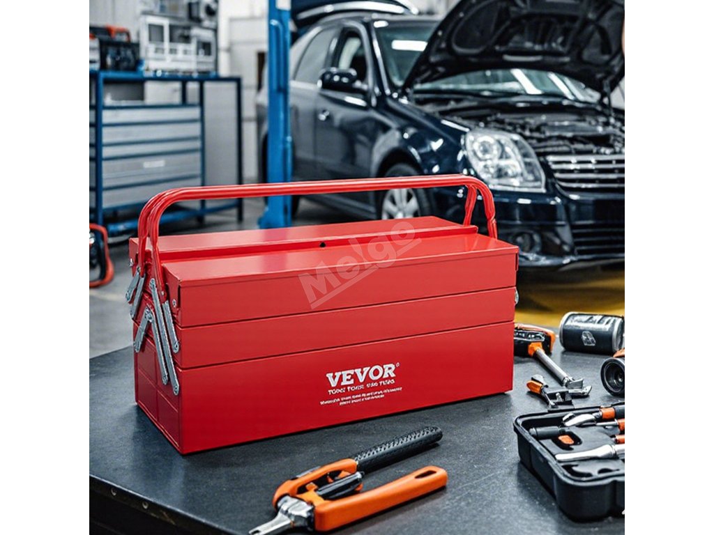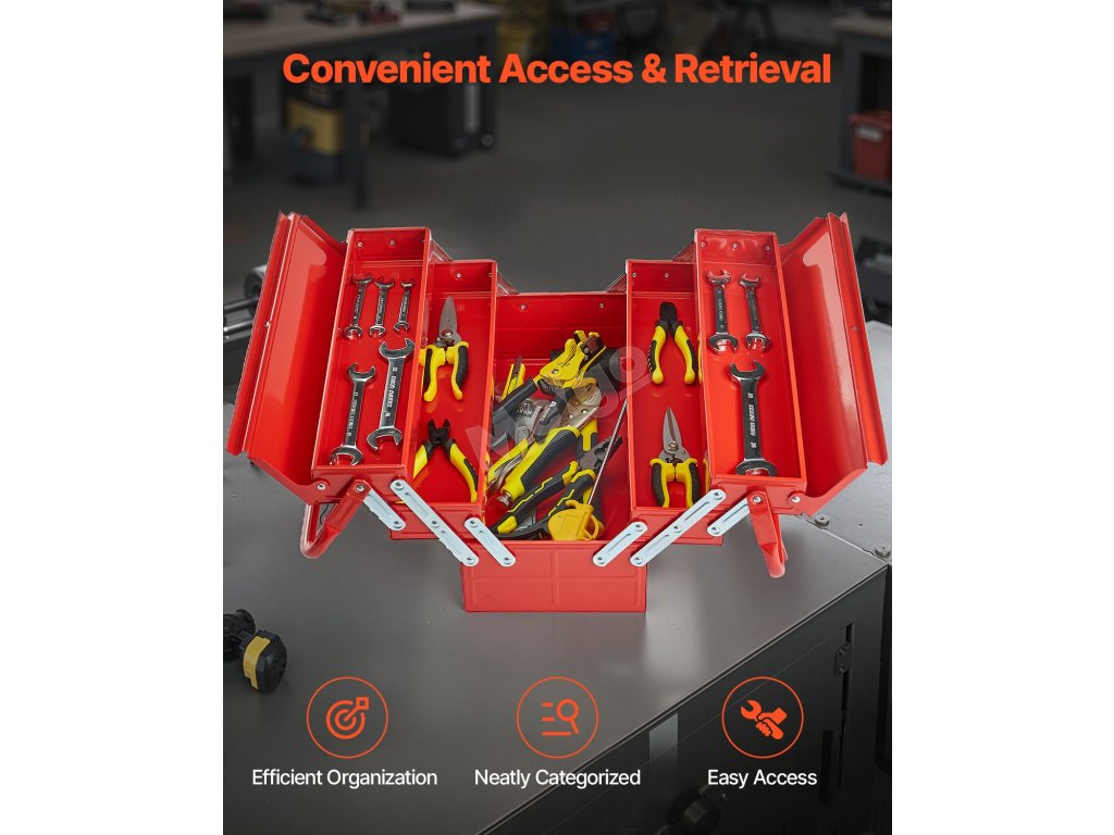 Pohodlná dvojitá držadla usnadňují přenášení kovového boxu na nářadí kamkoli. Plynulé otevírání výklopné horní části je umožněno několika zesílenými kovovými klouby, které zajišťují stabilitu a odolnost.