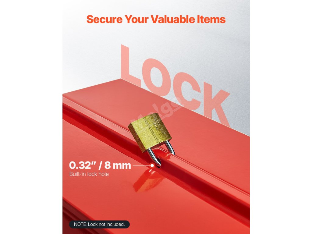 Ocelový box na nářadí má v horní části zabudovaný otvor pro zámek, který je kompatibilní s 0,32palcovými zámky, což zvyšuje bezpečnost vašich osobních věcí.