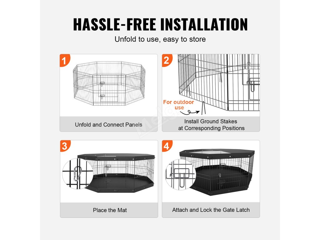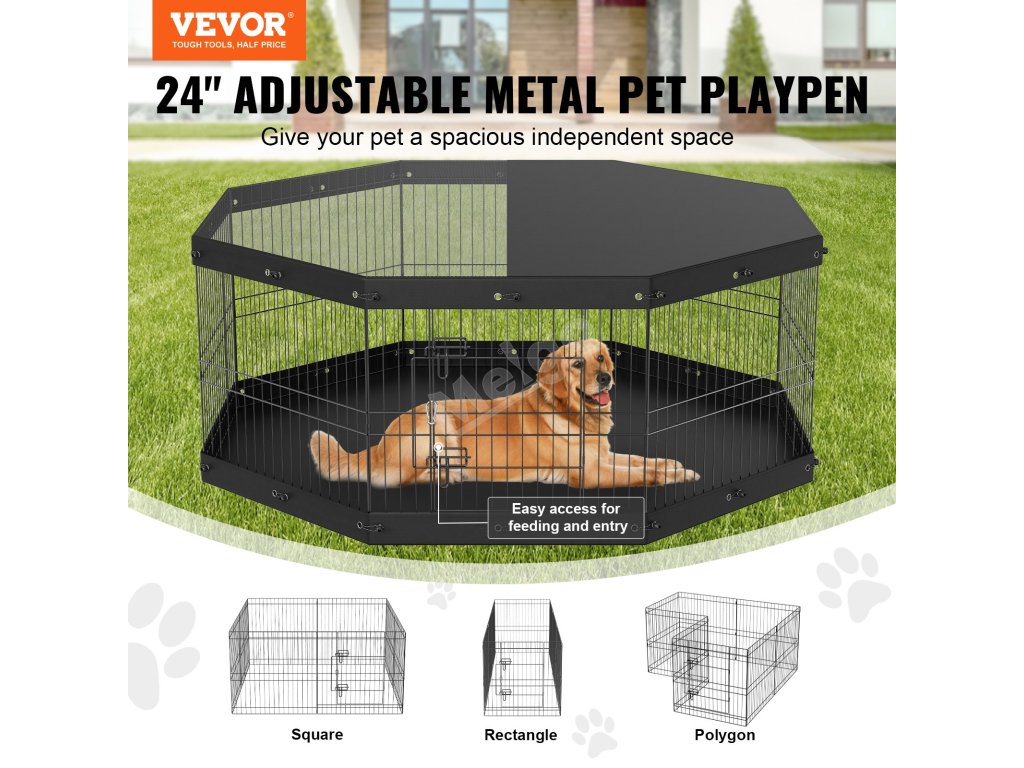 Naše 24" vysoká ohrádka pro psy je ideální pro domácí mazlíčky a něžná zvířata, jako jsou králíci, prasata, kočky, kachny a další. Při použití pro psy se doporučuje pro plemena, jako je labradorský retrívr, pudl, buldok, jezevčík a bígl. Není vhodný pro velká plemena, jako jsou němečtí ovčáci nebo rotvajleři.