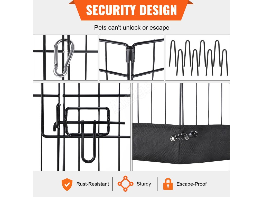 Tato ohrádka pro štěňata zajišťuje bezpečnost díky několika zámkům. Součástí je 8 zemních kolíků o průměru 3,9", 2 západky brány, 16 napínacích popruhů a 1 zámek s karabinou, který zabrání domácím zvířatům otevřít bránu nebo vyskočit ven. Robustní kov zabraňuje tomu, aby ji domácí zvířata převrhla nebo prokousala.