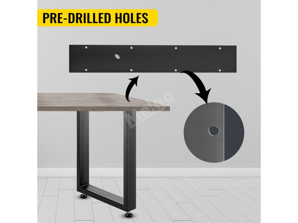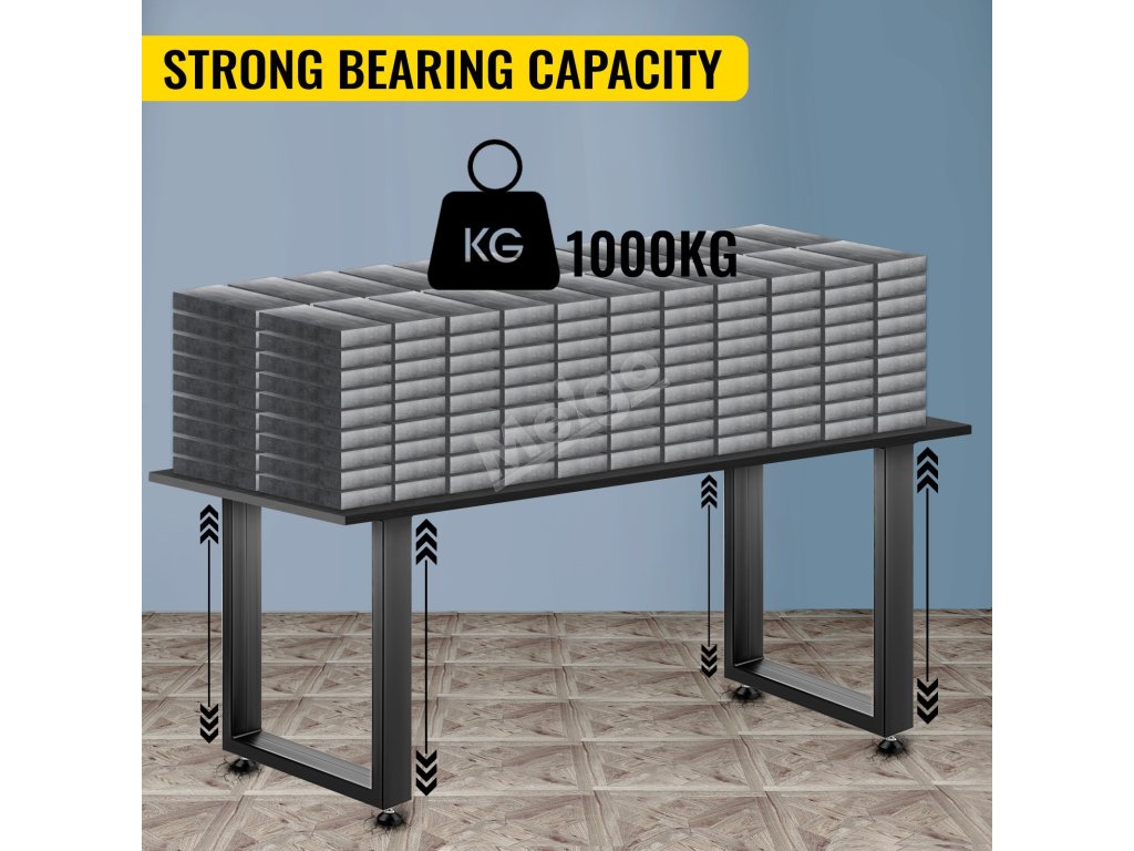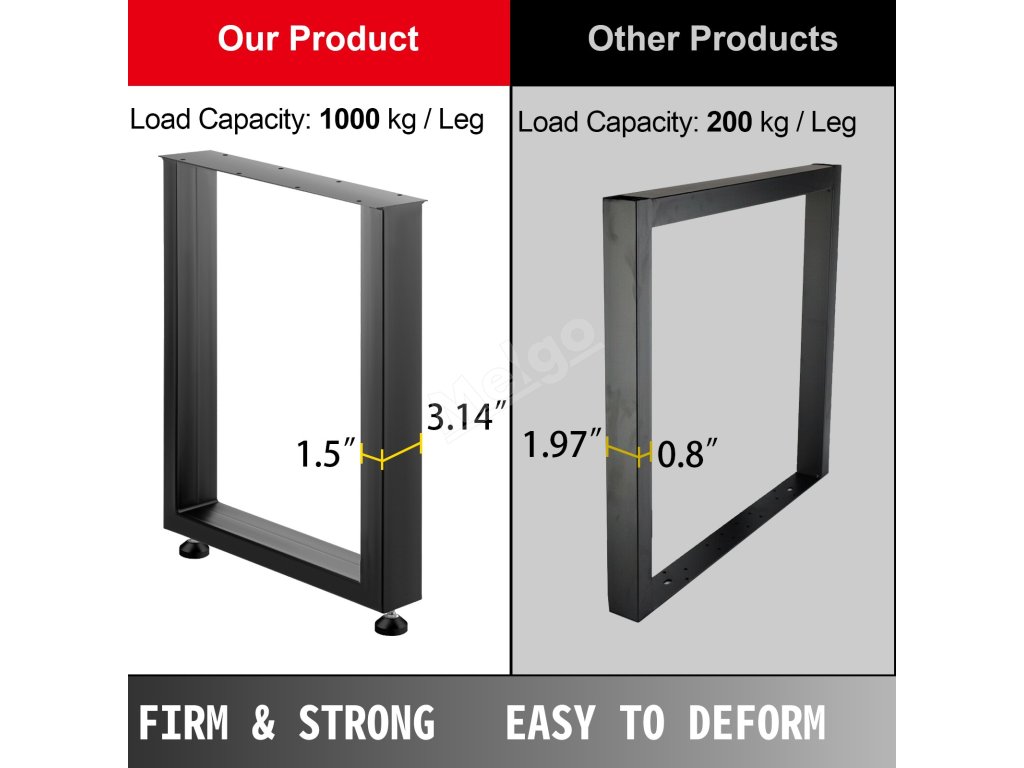 Silné nohy s maximální nosností 1000 kg/2204 lbs jsou dostatečně pevné, aby udržely těžké předměty. Silné ocelové trubky nabízejí těmto stolovým nohám vlastnosti, jako je vysoká pevnost, nerozbitnost.