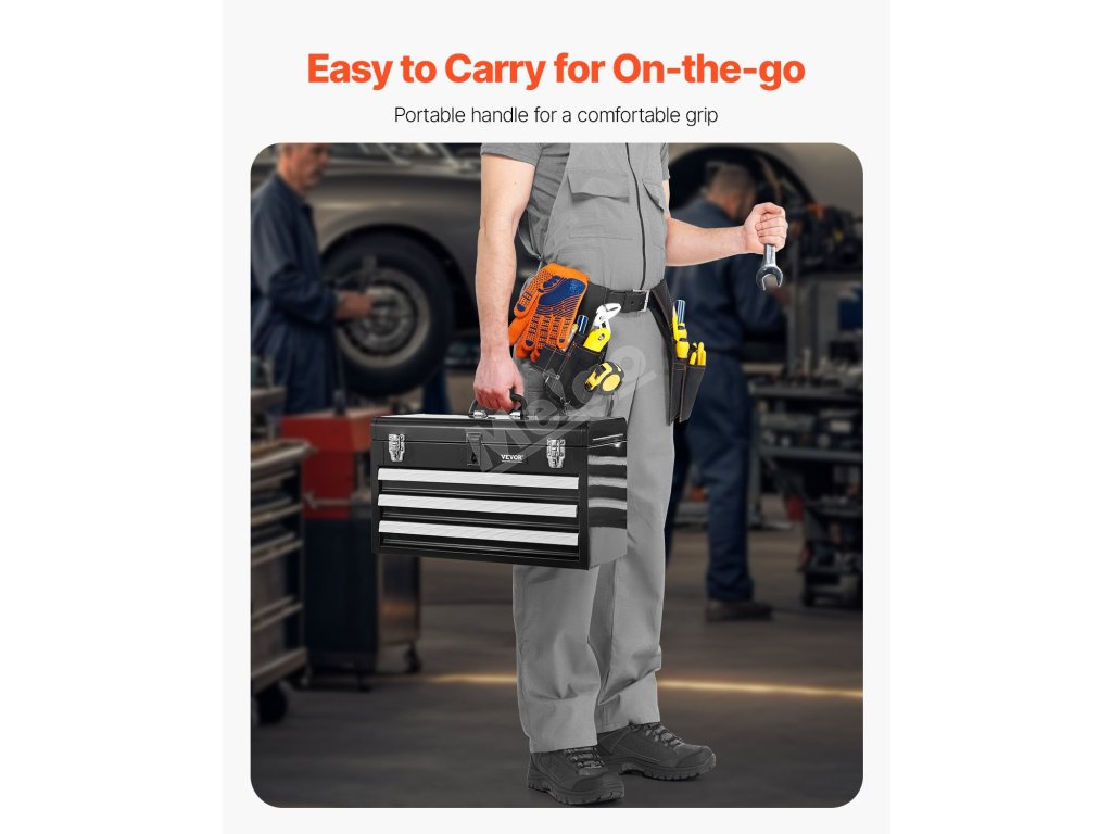 Díky praktickému madlu na horní straně můžete kovový box na nářadí snadno přenášet, kamkoli potřebujete. Hladké zásuvky s kuličkovými ložisky zajišťují plynulé otevírání a zavírání, takže ukládání je radost.