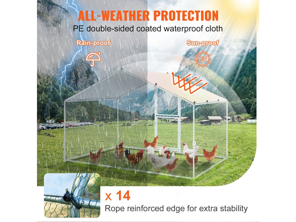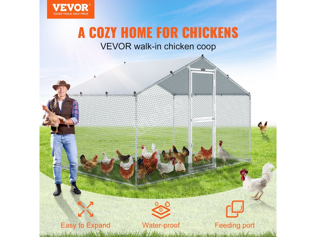Veľký kovový kurník VEVOR sa tak ľahko zostavuje. Rám sa rýchlo zacvakne, vďaka čomu je proces zostavovania hladký a efektívny. Dokonca aj s minimálnym množstvom náradia je montáž jednoduchá. Montáž ľahko zvládne jedna alebo dve osoby. Odolná konštrukcia zahŕňa oceľ a PE materiály, čo zaručuje dlhodobú spoľahlivosť. Táto vlastnosť umožňuje priechodnú konštrukciu kurína. Do interiéru sa dá ľahko dostať na čistenie a údržbu. Vďaka odolným materiálom a jednoduchej montáži je praktickou voľbou pre každého hospodára.