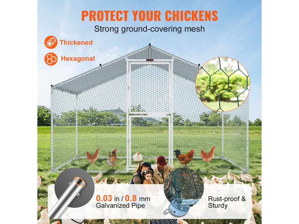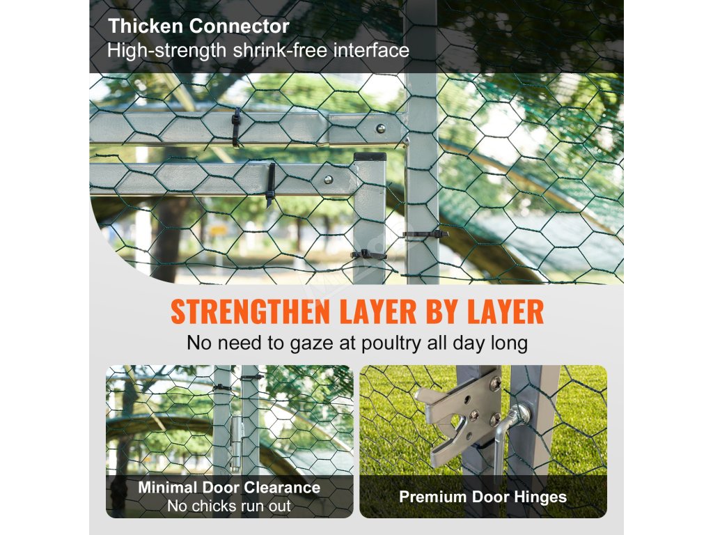 Veľký kovový kurník VEVOR je vybavený pevným oceľovým rámom, ktorý poskytuje dlhodobú oporu a stabilitu. Oceľový rám je navrhnutý tak, aby odolal rôznym poveternostným podmienkam a vonkajším tlakom. Táto robustná konštrukcia zabezpečuje, že kurník zostane stabilný a bezpečný aj vo veterných podmienkach. Okrem toho je vďaka oceľovému rámu kurník odolný voči deformácii a poškodeniu, čo predlžuje jeho životnosť. Dôležitý je tento robustný nosný systém pre zachovanie celistvosti kurína a zaistenie bezpečnosti vašich zvierat. Okrem toho môžete kurník premiestňovať pri akejkoľvek potrebnej manévrovateľnosti v rámci usporiadania vášho dvora.