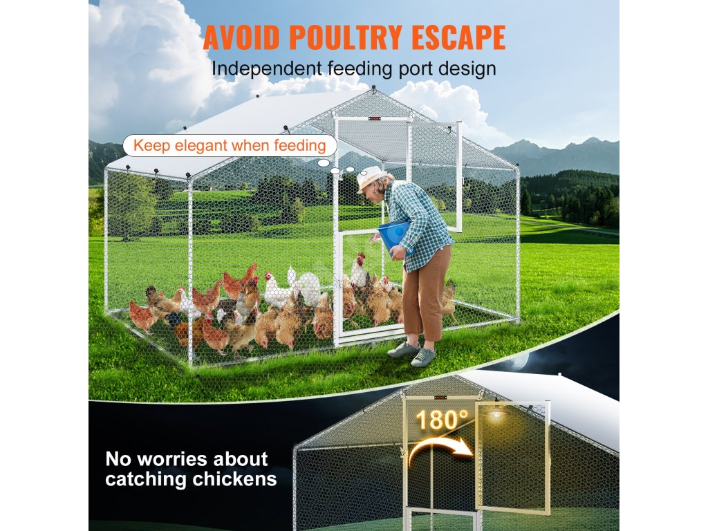 Veľký kovový kurník VEVOR má funkciu walk-in, ktorá uľahčuje údržbu a čistenie. Vchodové dvere poskytujú dostatok priestoru na vstup do kurína a starostlivosť o zvieratá. Táto funkcia je obzvlášť užitočná pri pridávaní krmiva, výmene vody a čistení interiéru. Okrem toho ľahký prístup uľahčuje monitorovanie zdravia a pohody vašich domácich zvierat. Vďaka tejto funkcii prechádzania môžete pre svoju hydinu udržiavať hygienické a pohodlné prostredie.