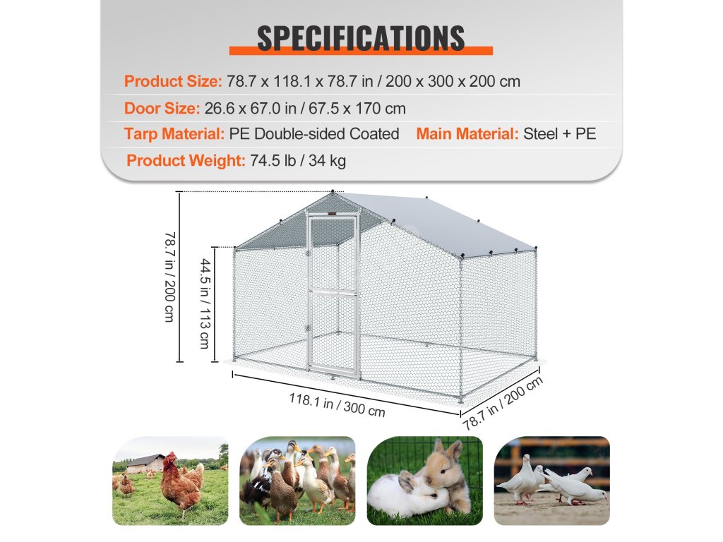 Veľký kovový kurník VEVOR poskytuje bezpečný a priestranný domov pre vašu hydinu. Má rozmery 78,7 x 118,1 x 77,9 palca, čo vám poskytuje dostatok priestoru pre kurčatá, kačice a králiky. Súčasťou konštrukcie je "strecha s vrcholom", ktorá zlepšuje celkový priestor a zabezpečuje lepšie prúdenie vzduchu. Táto priestranná konštrukcia umožňuje vašim zvieratám voľný a pohodlný pohyb, čo z nej robí ideálnu voľbu pre každú záhradnú zostavu. Robustná konštrukcia kurína a široký interiér zabezpečujú, že vaše domáce zvieratá majú ideálne, čisté prostredie, v ktorom sa im bude dariť.