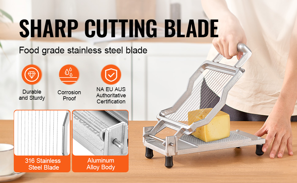 Krájejte jedním stisknutím a tahem, čímž bez námahy vytvoříte rovnoměrně čisté plátky sýra a chleba. Ostré řezné čepele jsou dostatečně tvrdé a ostré pro rychlé krájení sýra.