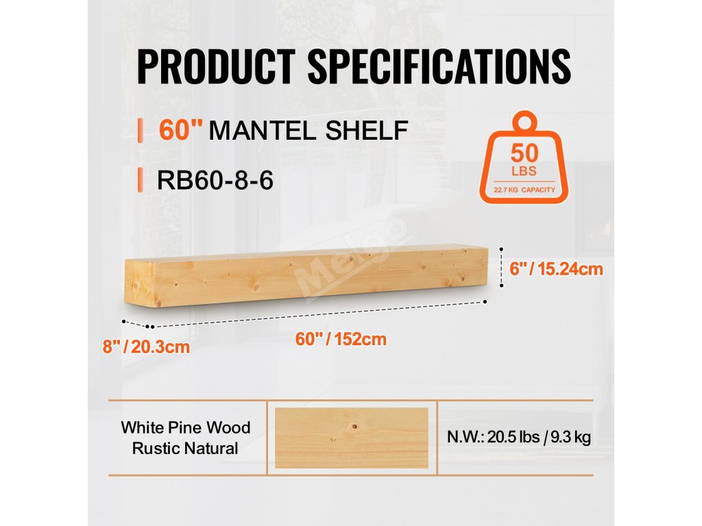 Krbový mantel 60"×8"×6", dřevo, nosnost 50 lbs, nástěnný plovoucí