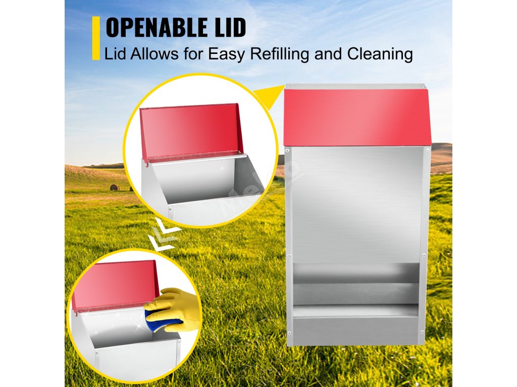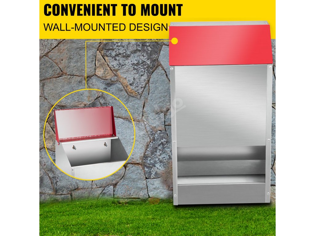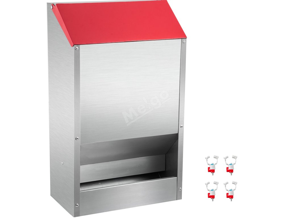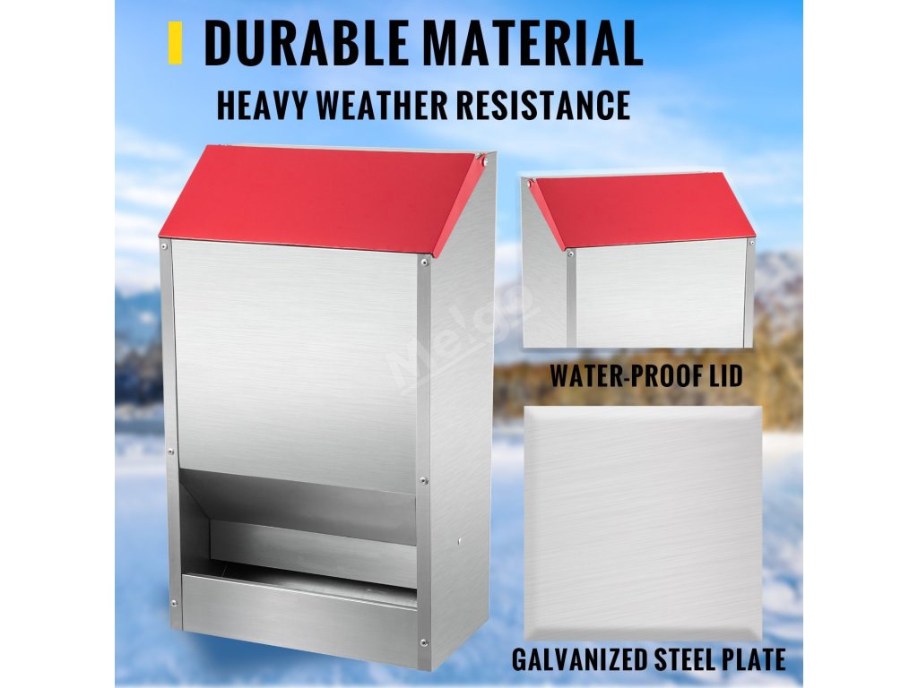 Krmítko pro kuřata je vyrobeno z pozinkované oceli, je vodotěsné, odolné proti korozi a má dlouhou životnost. Můžete jej používat i venku za silného deště nebo sněžení.